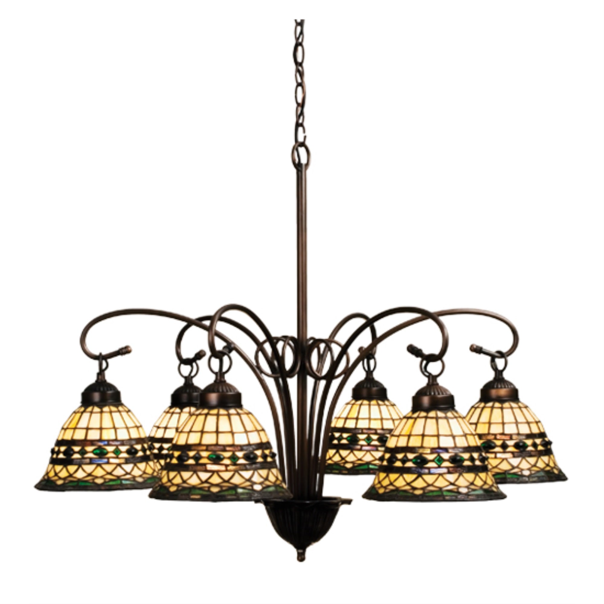 18528 31'W Tiffany Roman 6 Lt Chandelier Manufacturer By Meyda. Emerald-Colored Jewels And Multi Colored Granite Glass; Accent The Handsome Amber Beige Art Glass Reproduction Of A Famous Louis Comforttiffany Design. This Tiffany Roman Shade Is Inspired By Italian Art And Architecture And Is Handcrafted Of Authentic Stained Glass By Meyda Tiffany Artisans Using A Copperfoil Construction Method. The Six Light Chandelier Hardware Is Finished In A Hand Applied Mahogany Bronze. Lens Color : Green;Blue;Violet;Chocolate;Beige, Made In China
