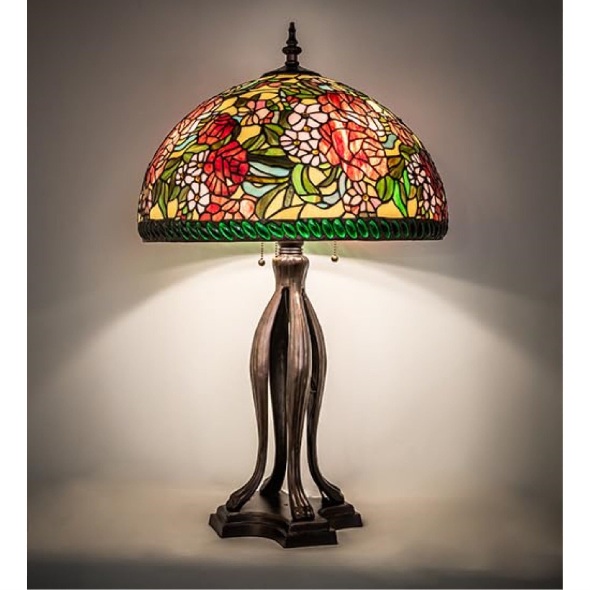 The Romance Rose Lamp Features Brilliant Red And Pink Roses Accented With Green Leaves On A Beige Art Glass Background. The Art Glass Shade Is Accented With Emerald Colored Glass Jewels And Created Using The Famous Meyda Tiffany Copperfoil Construction Process. The Shade Is Embraced By An Elegant Case Base In A Mahogany Bronze Finish. A 3-Light Pull Chain Cluster Offers 3 Lamps For Additional Ambient Lighting Capabilities. Ul And Cul Listed For Dry Locations. Each Shade Is A Unique Work Of Art With Color Variations Based On Natural Ingredients Inherent In The Glass. Contact Us If Color Matching Is Critical When Ordering Multiple Items.