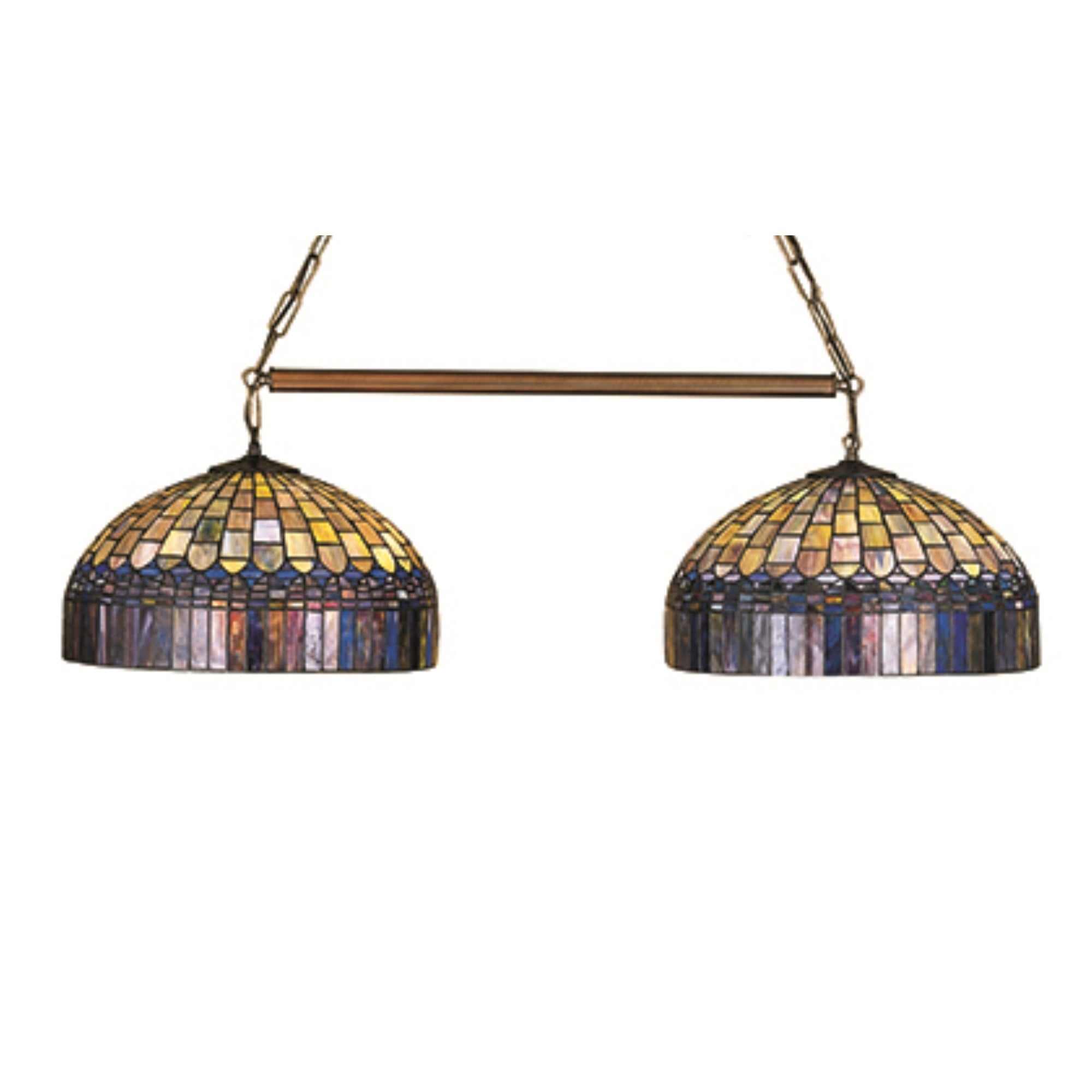28515 42 Long Tiffany Candice 2 Light Island Pendant Manufacturer By Meyda. In The Early 20Th Century; Tiffany Studios Used Artful Mastery To Develop The Look Of Woven Fabric With A Fringed Skirt Out Of Glass. Meyda Tiffany Is Able To Configure This Timeless Reproduction Into A Stunning 2-Light Pendant For Illuminating Kitchen Islands; Dining/Billiard Tables; Counters And Bars. The Two Shades Feature Multi-Hued Plum Fringe With Dome Brickwork That Reveals Emerald; Cobalt; Heather; Xanadu; Azure And Saffron Art Glass. The Art Glass Shades Are Created Using The Famous Meyda Tiffany Copperfoil Construction Process And Are Enhanced With A Mahogany Bronze Finish. Ul And Cul Listed For Dry And Damp Locations. Lens Color : Amber Glass (Not Mica);Green;Violet, Made In China