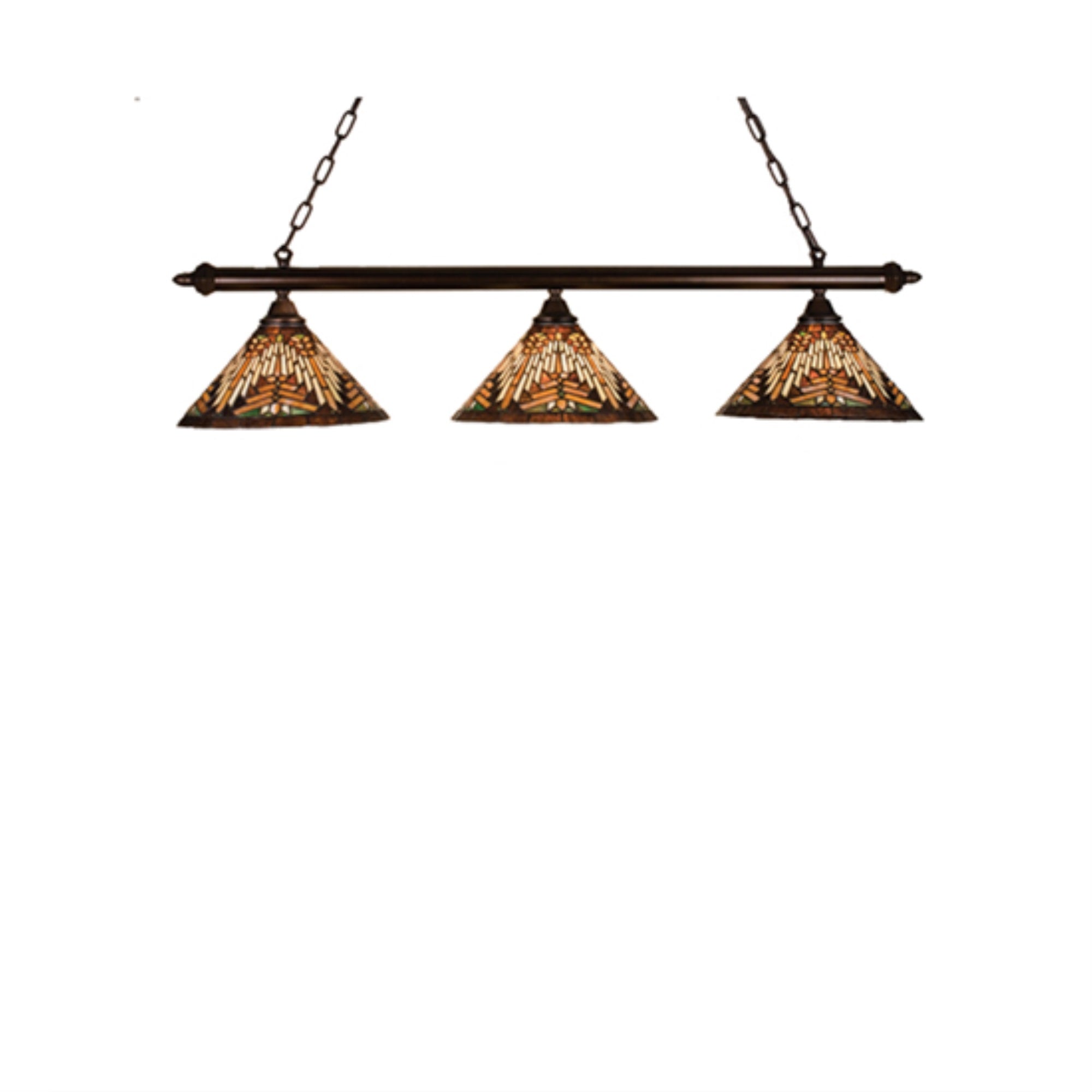18860 47'L Nuevo Mission 3 Lt Island Pendant Manufacturer By Meyda. Warm Earth Toned Bone Beige And Moccasin Tan Stained Glass; Accented With Glistening Root Brown And Sage Green; Is Used To Make This Intricate Interlocking Patterned Shade. A Three Light Island In A Hand Applied Mahogany Bronze Finish Supports The Handsome Round Cone Shades Inspired By Historic American Artwork. Handcrafted With The Copper Foil Technique Developed By Louis Comfort Tiffany; This Island Is A True Masterpiece. Lens Color : Mauve;Beige, Made In China