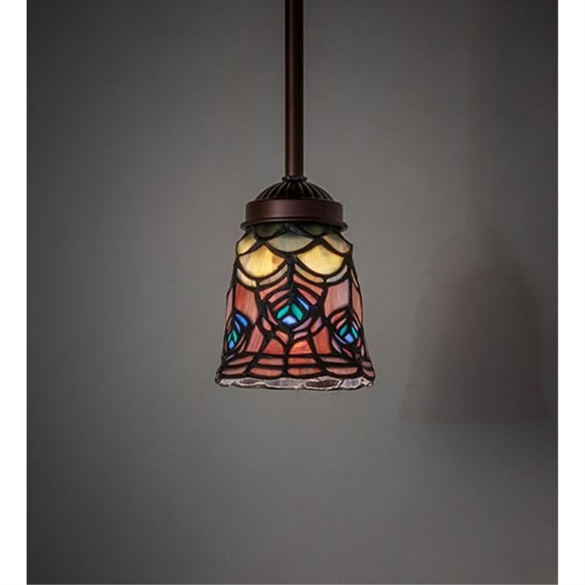 Mauve With Beige; Pink; Orange; And Gray Art Glass Adorn This Shade; While Feathers Feature Turquoise; Blue; And Purple. A Scalloped Crest Of Purple; Blue; Orange; & Green Edges The Shade Created Using The Meyda Tiffany Copperfoil Construction. Overall Height Ranges From 15 To 67 Inches As The Suspension Rod Adjusts & Assembles In The Field Using Four Included Tube Lengths In Mahogany Bronze Finish. To Create A Dramatic Design Statement; Install These Mini Pendants In Groups To Illuminate Bars; Counters; And Kitchen Islands In Residential; Commercial; And Hospitality Settings. The Tiffany Peacock Feather Mini Pendant Is Featured In Our American-Designed; Handcrafted Tiffany Reproduction Stained Glass Lighting Collection. Ul & Cul Listed For Dry And Damp Locations. Each Shade Is A Unique Work Of Art With Color Variations Based On Natural Ingredients Inherent In The Glass.
