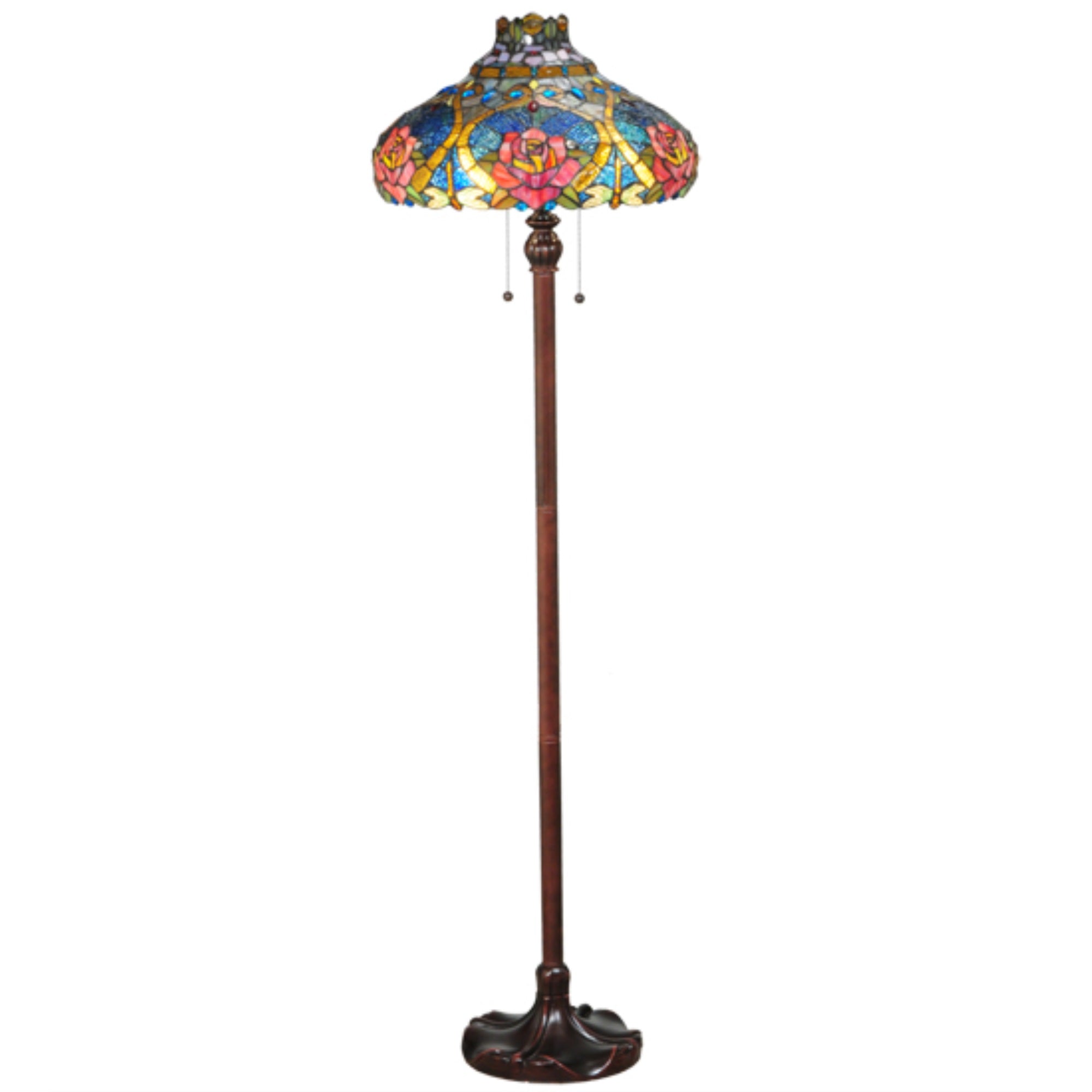 138109 60'H Dragonfly Rose Floor Lamp Manufacturer By Meyda. The Dragonfly Re-Creates Tiffany Studio'S Most Beloved Designs In All Of Its Splendor. A Dragonfly Flies And Dives Downward With Glowing Golden Jeweled Eyes And Delicate Yellow And Green Glass Wings That Circle Over Hand-Cut And Copperfoiled Pieces Of Golden Scrolls With Sky Blue; Clear And Red Jeweled Dew Drops. Red Cabbage Roses Are Featured On A Blue And Green Background Which Is Topped With A Crown Of Lavender Flowers.The Art Glass Shade Is Created With Meyda Tiffany?S Famous Copperfoil Construction Process And Complemented With A Mahogany Bronze Finished Base. Lens Color : Ruby;Pink;Sunflower;Amber Glass (Not Mica);Green;Blue, Made In China