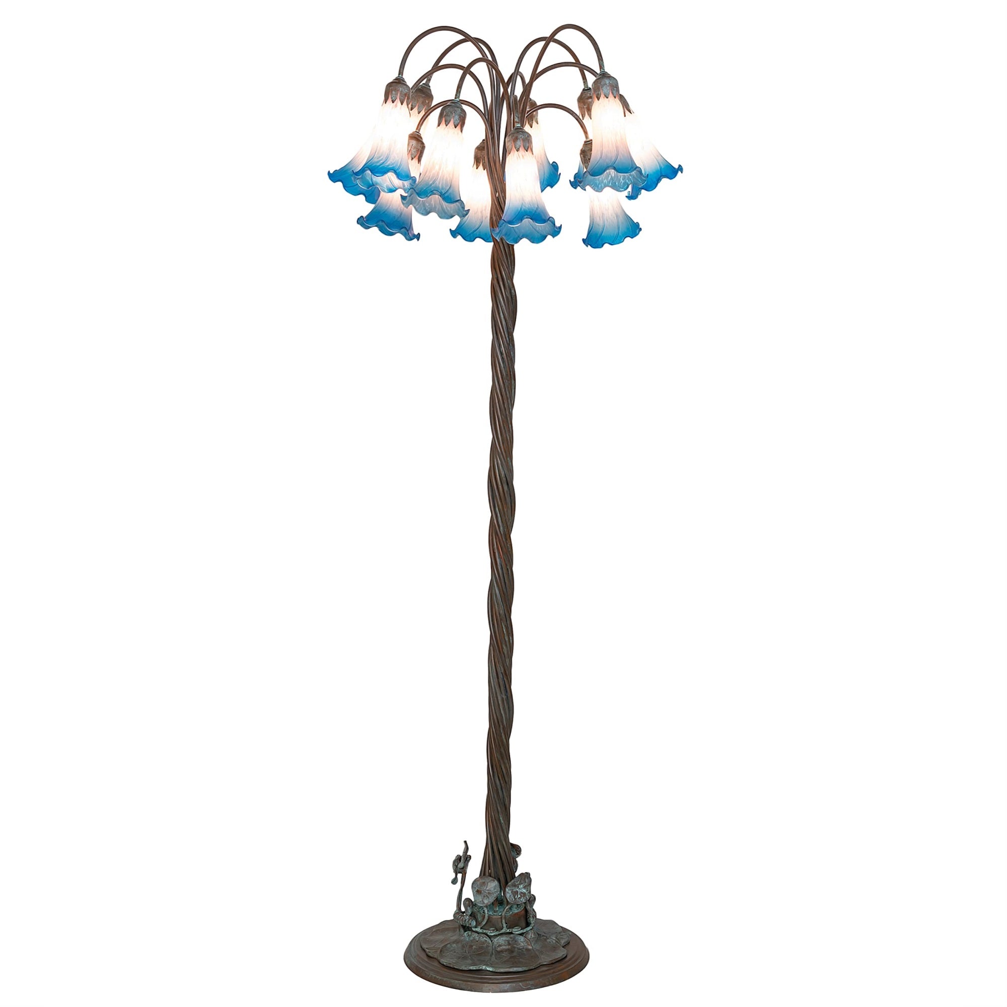 This Stunning Floor Lamp Offers An Attractive; Delicate Design Featuring 12 Shades Created With Amber And Blue Favrile-Style Mouth-Blown Art Glass. The Pond Lily Shades Are Embraced By An Elegant Cast Metal Floor Base With Floral And Vine Accents Finished By Hand In Bronze. The Pond Lily Floor Lamp Is Featured In Our American-Designed; Handcrafted Favrile Glass Lighting Collection. Ul And Cul Listed For Dry Locations. Each Shade Is A Unique Work Of Art With Color Variations Based On Natural Ingredients Inherent In The Glass. Contact Us If Color Matching Is Critical When Ordering Multiple Items.