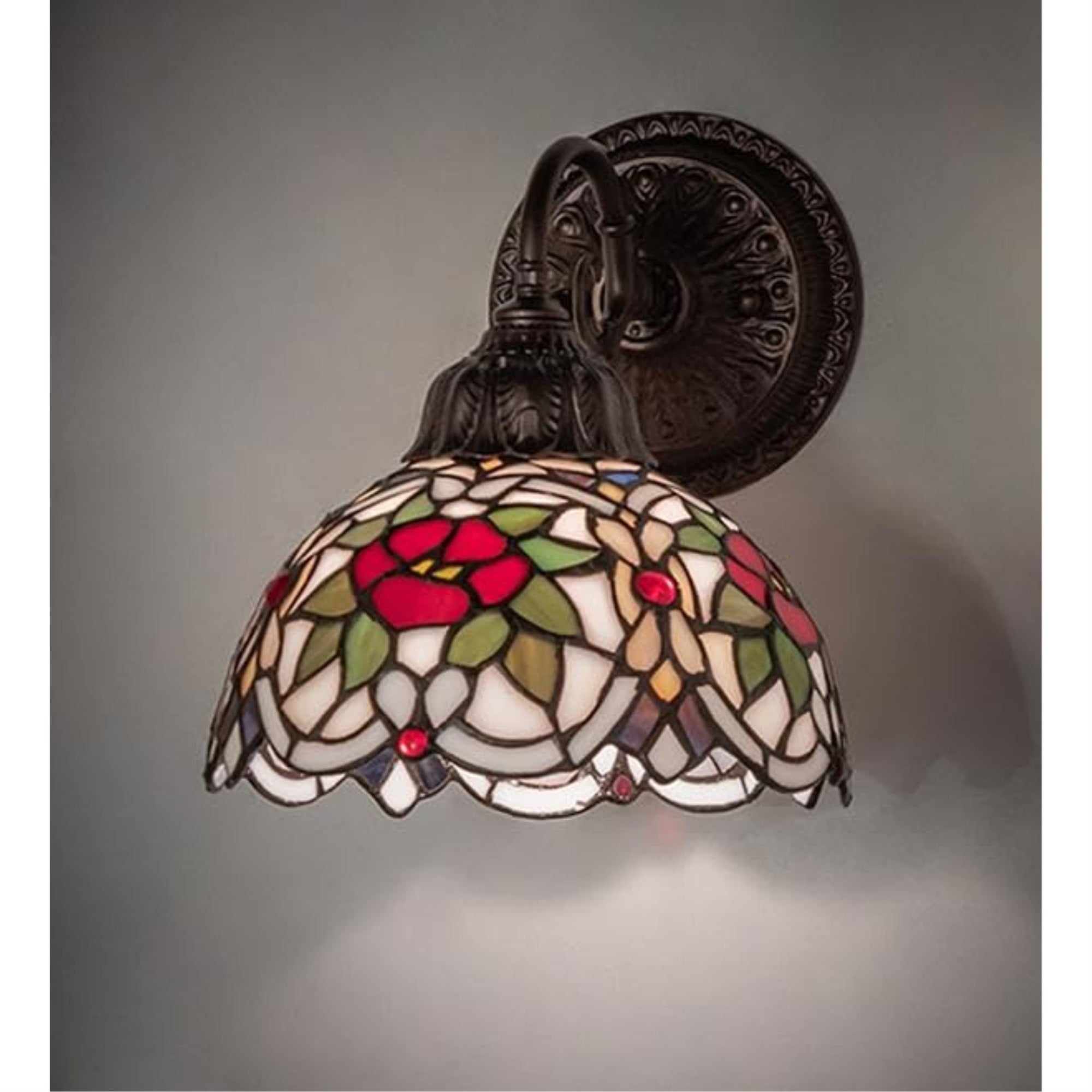 This Tiffany Styled Stained Glass Shade Will Add Beauty And Elegance To Your Home. The Renaissance Rose Shade Features A Red Rose Framed In Woodland Green Leaves And Ivory Scrolls That Sit On A Lavender And Plum Bronze Lace Art Glass Background. This Stunning Shade Is Created Using The Famous Meyda Tiffany Copperfoil Construction Process; And Is Paired With An Elegant Victorian Styled Cast Metal Hardware Finished In Mahogany Bronze. The Renaissance Rose Sconce Is Included In Our American Designed; Handcrafted Tiffany Reproduction Lighting Collection. Ul & Cul Listed For Dry And Damp Locations. Each Shade Is A Unique Work Of Art With Color Variations Based On Natural Ingredients Inherent In The Glass. Contact Us If Color Matching Is Critical When Ordering Multiple Items.