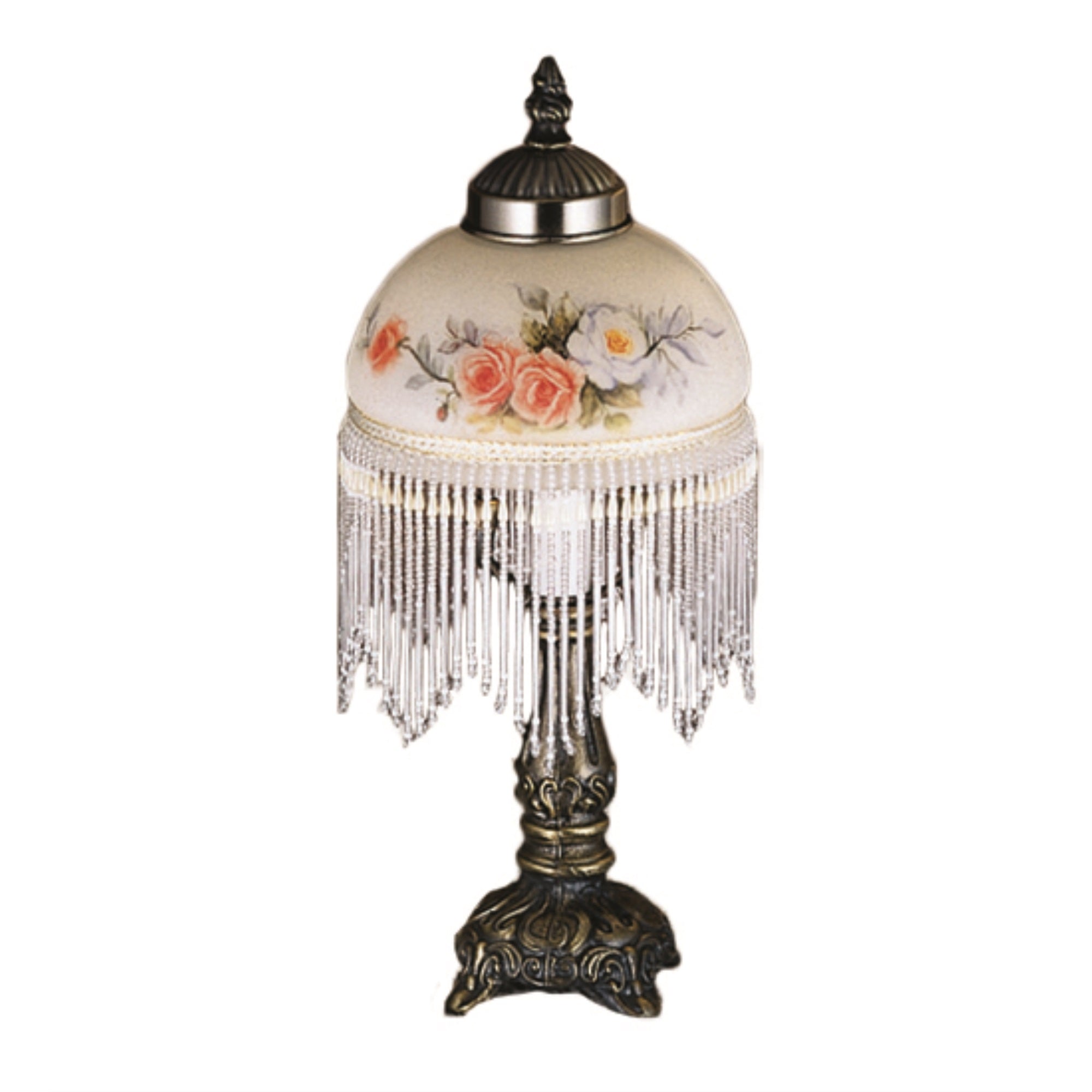 21191 8'H Roussillon Rose Bouquet Fringed Mini Lamp Manufacturer By Meyda. A Charming Nostalgic Mini Table Lamp. This Roussillon Mini Lamp Features A Stunning White Art Glass Shade With A Rose Bouquet Fused Image Featuring Red; Pink And White Roses With Green Leaves. The Shade Is Accented With Color Coordinated With Delicate Clear Glass Beaded Fringe. This Victorian-Inspired; Intricately Detailed Shade Is Combined With A Beautifully Detailed Lamp Base In A Mahogany Bronze Finish. Ul And Cul Listed For Dry Locations. Lens Color : Ruby;Pink;Green;White, Made In China