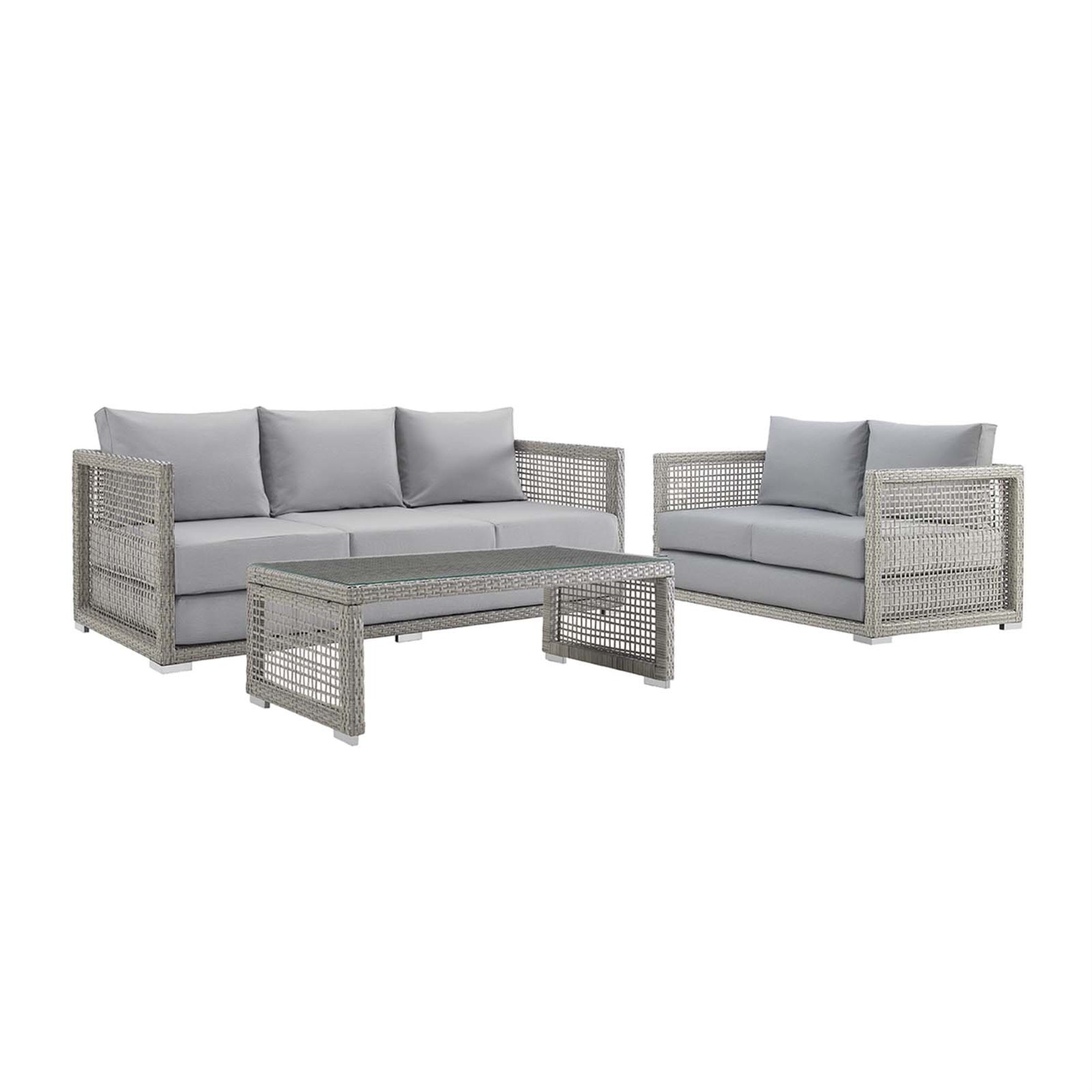 Aura Outdoor Patio Collection - Stylish & Functional Gray Wicker Rattan Set With Aluminum Frame. Includes Coffee Table, Loveseat, And Sofa.