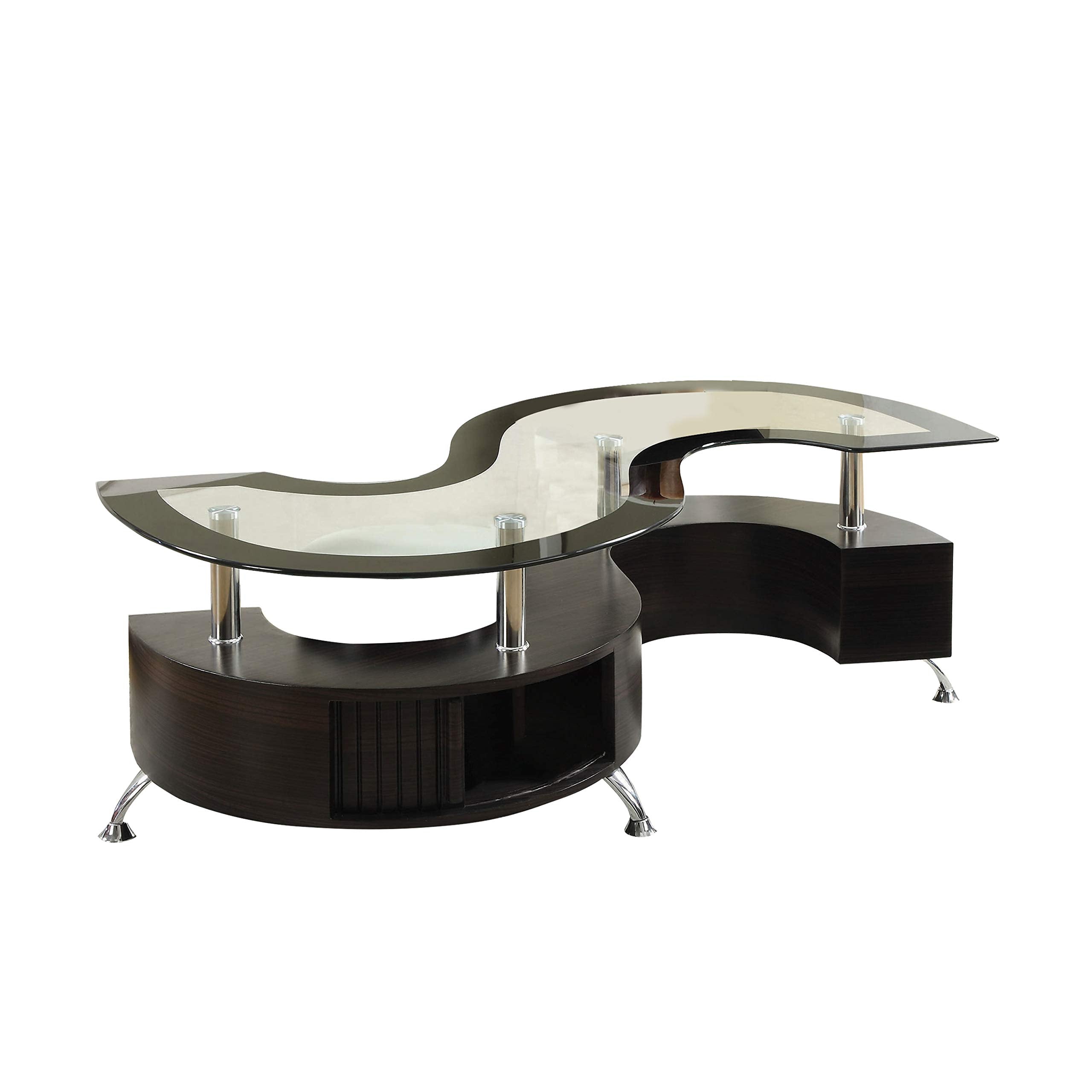 Add A Contemporary Flair To Your Living Room With This Coffee Table Featuring A Sturdy Solid Wood Base In Espresso Brown Finish, It Incorporates An S-Shaped Tempered Glass Tabletop With Black Edges That Rests On The Tubular Chrome Base Supported On Metal Legs, It Is Incorporated With Built In Versatile Storage