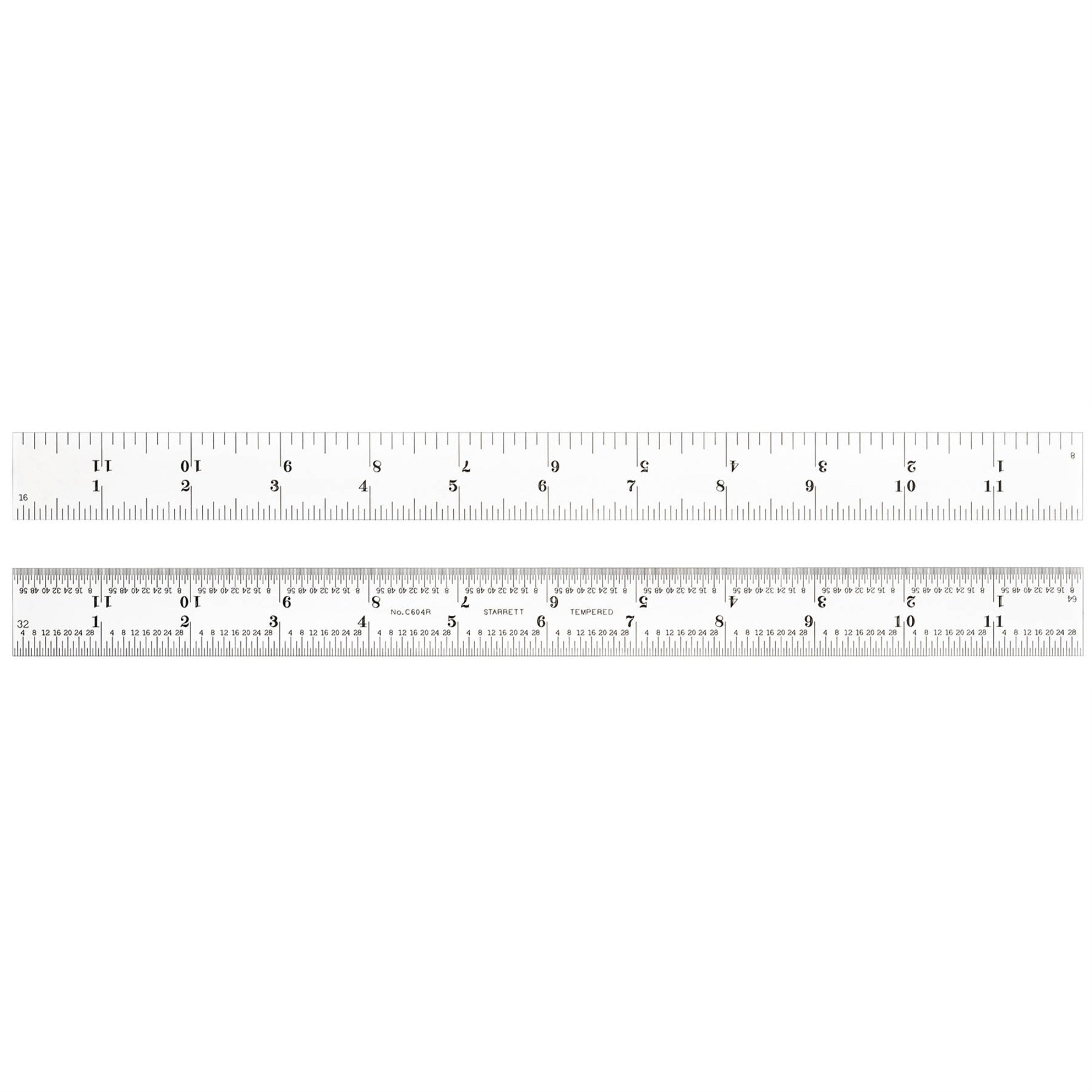 The Starrett 12 Spring-Tempered Steel Rule With Inch Graduation Features A Satin Chrome Finish. Graduations At 8Ths, 16Ths, Quick-Reading 32Nds, 64Ths. 12, 4R Grad, Certification.