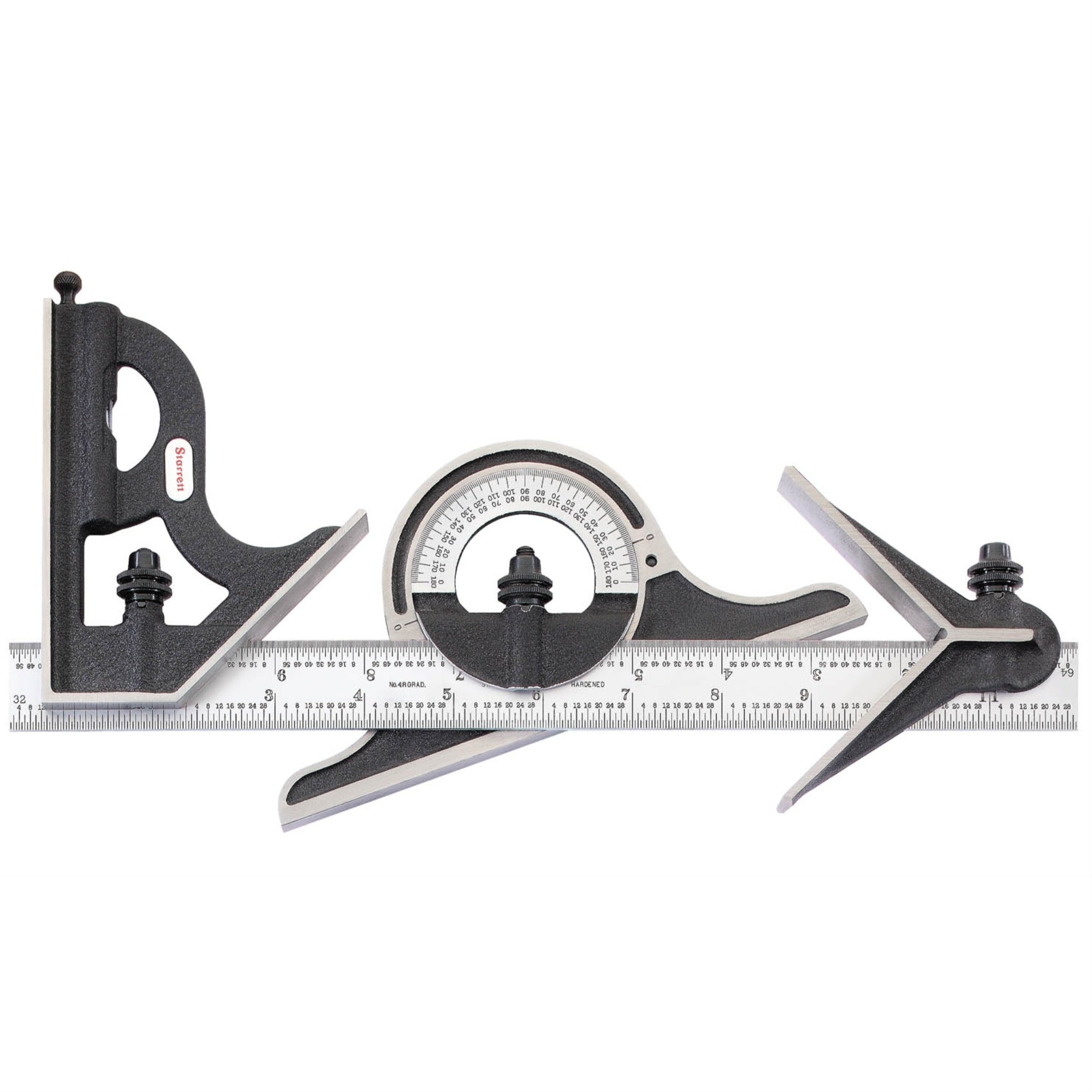 The Starrett 12' Combination Set With Square, Center And Non-Reversible Protractor Head And Blade Includes A Reversible Lock Bolt, Scriber, Spirit Level In Both Square Head And Protractor Head, Direct Reading Double 180 Protractor Scale, And Hardened Steel, Photo-Engraved Blade. Cast Iron Heads With Black Wrinkle Finish. Satin Chrome Blade And Protractor Head. 12, 4R Grad, Satin Chrome Blade