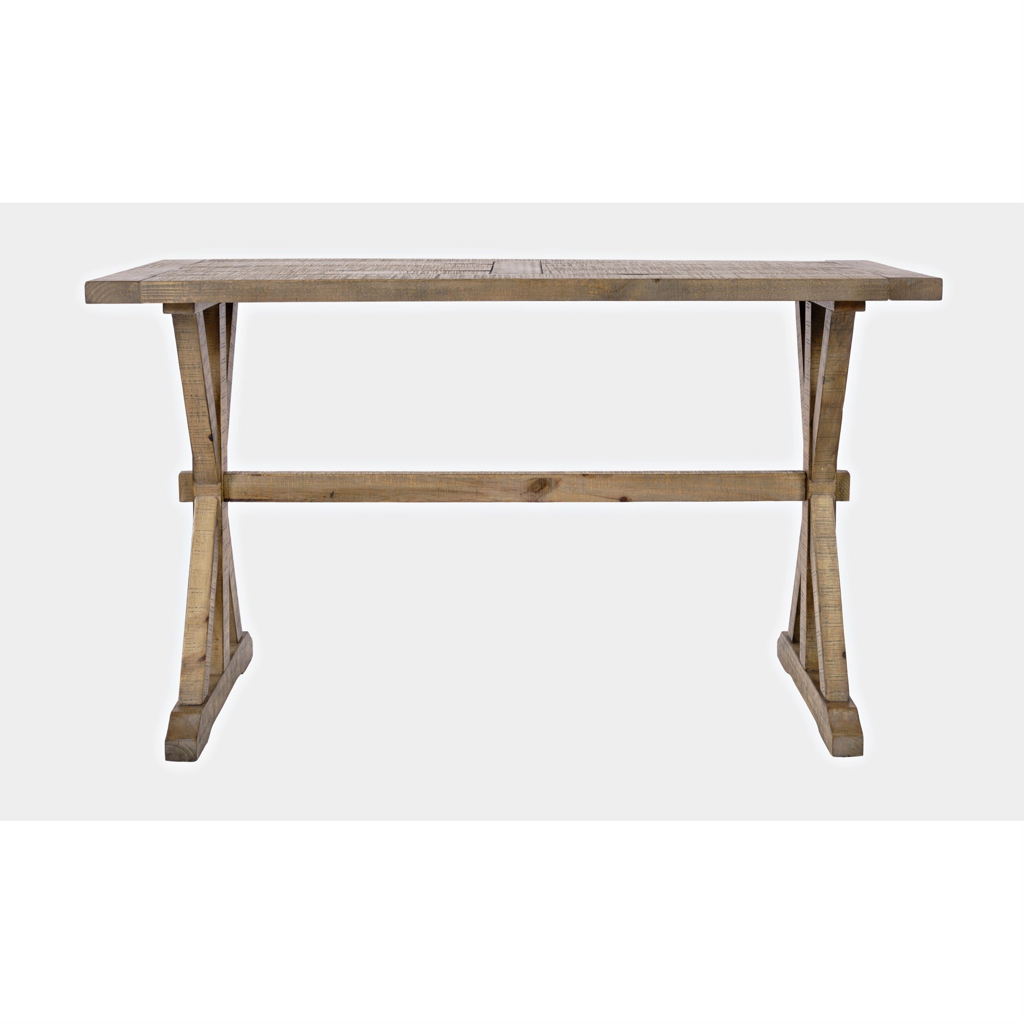 Rustic Solid Pine On A Farmhouse Pedestal And Trestle Base Creates The Perfect Blend Of Classic And Modern Style With The Carlyle Crossing Sofa Table. The Base With Cross-Beam Supports Are Naturally Distressed With Plenty Of Character, And A Table Top With A Unique Framed Corner Design Adds A Little Farmhouse Flair To Your Home.