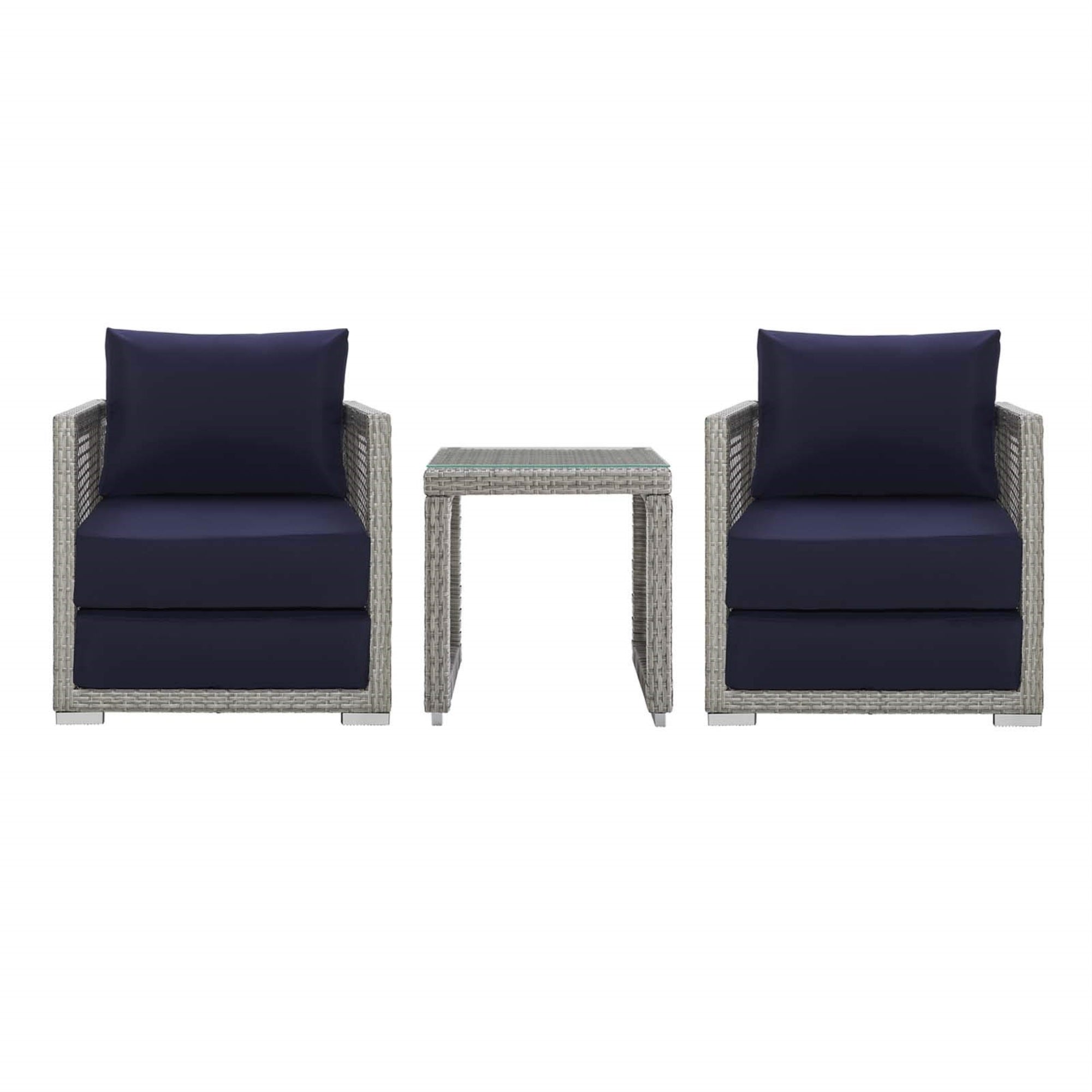 Casafoyer Aura Outdoor Patio Wicker Rattan, Side Table And Two Armchairs, Gray Navy