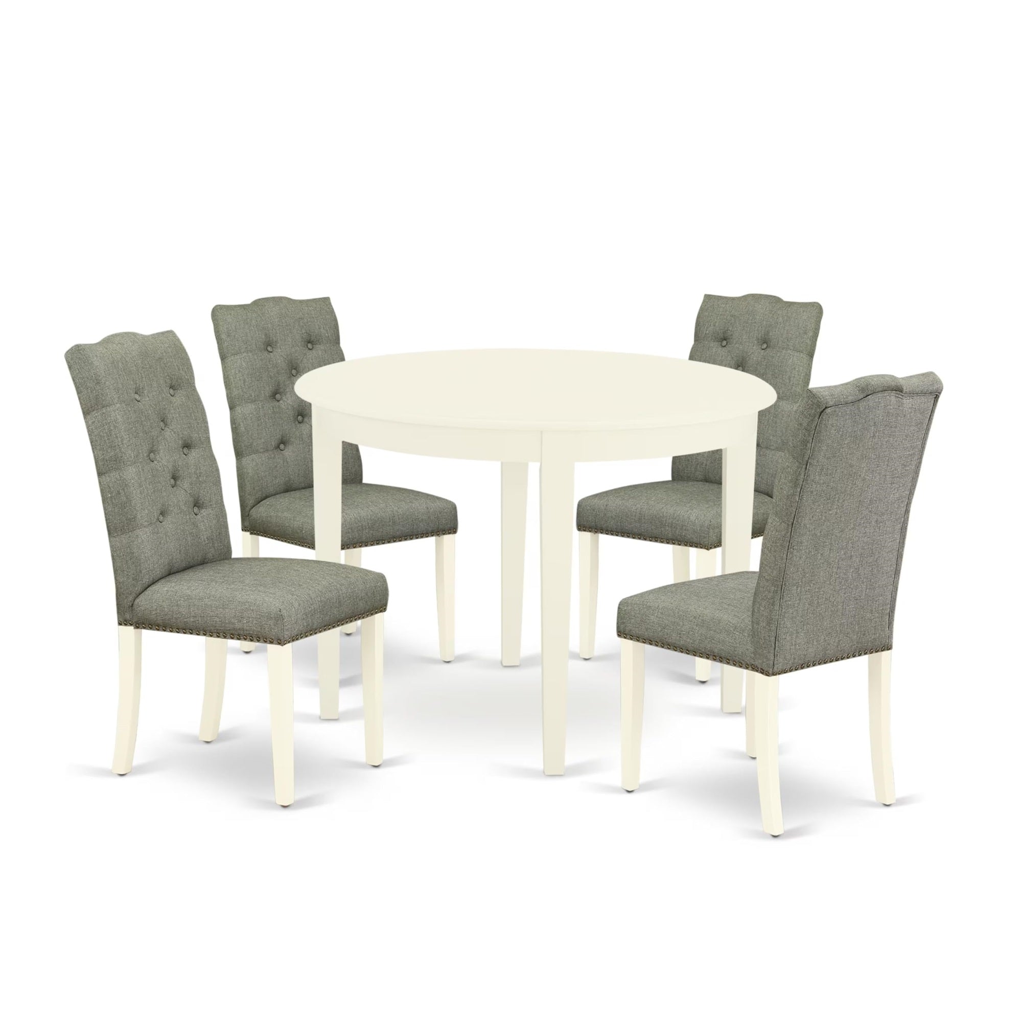 Boel5-Whi-07 East West Furniture Boel5-Whi-07 5-Pc Mid Century Dining Set Included A Round Dinner Table & 4 Padded Parson Chairs, Smoke Linen Fabric Modern Dining Chairs Seat With Rubber Wood Legs, Linen White Finish, East West Furniture 5-Piece Kitchen Dinette Set Including 4 Kitchen Chairs And A Round Luxurious Dining Room Table Will Improve The Charm Of Your Dining Area Or Kitchen Areas. Our Table And Chairs Dining Set Is Made Of Solid Asian Wood, Known As Rubber Wood, Which Is Rugged Enough To Withstand Years Of Use. It Also Has An Ergonomic Design, Which Is Very Comfortable. Single Round Dining Table With 4 Parsons Dining Room Chairs Is In Linen White Finish. This Round Dinette Set Would Add Charm And Attractiveness To Your Kitchen Or Dining Room. This Dining Room Table Is Flexible And Cozy. This Wood Dining Table Features A Compact Design Perfect For Small Spaces. The Parsons Chair Seat Is Made From Soft Linen Fabric Cushion, With Solid Rubber Wood Legs And Stylish Soft Linen Fabric Backrest With Asian Wood Frame, Soft Cushion, And Stylish Button Tufted Backrest Design To Make You More Comfortable. Our Dining Kitchen Table Set Adds Some Modern Elegance To Your Home. Parson Dining Chairs And A Kitchen Table Offer Plenty Of Space For Your Family Or Friends. The Simplistic And Beautiful Style, Accentuated By A Glossy Linen White Finish. You Will Certainly Enjoy This Stunning Mid Century Dining Table Set. It'S Quick To Construct The Kitchen Chairs And Round Dining Table With A Basic Tool. No Additional Tools Are Required. Easy-To-Follow Guidelines, Tools, And Hardware Are Included. With The Help Of A Damp Cloth, You Will Clean Your Dusty Easily. Buy Our Products In Complete Confidence, Because Your Satisfaction Is Our #1 Priority. Feel Free To Contact Us, We Are Always Here For You.Features:Linen Fabric Padded Parson Chair Seat Color: Smokepadded Parson Chair Legs Color: Linen Whitekitchen Chairs Sizes: Length 24.5; Width 19; Height 40.5Dining Room Table Color: Linen Whitedining Room Table Sizes: Length 42; Width 42; Height 30Included: A Stunning Mid Century Dining Table And 4 Excellent Parson Chairs.