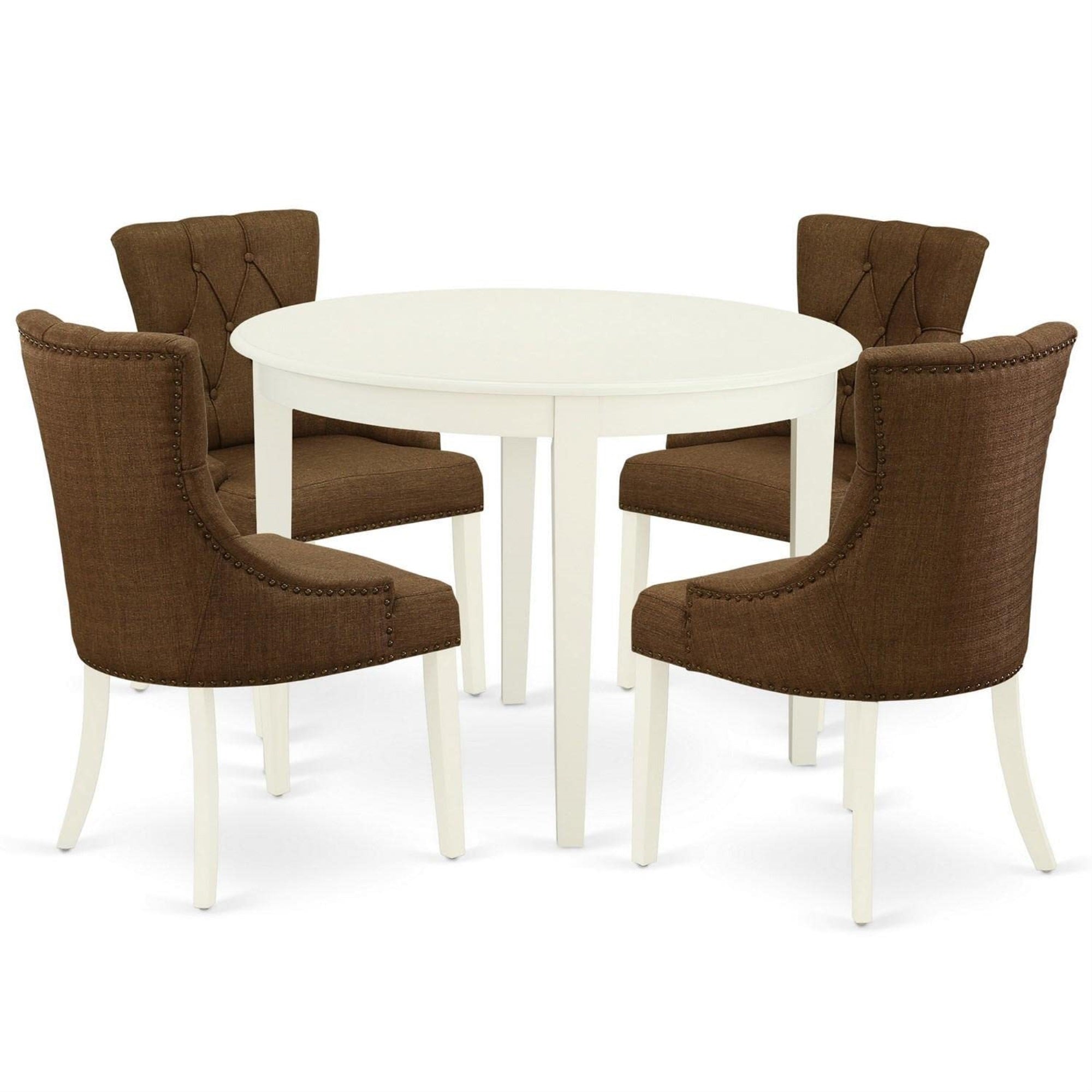 Bofr5-Whi-18 Bofr5-Whi-18 5Pc Dining Set Includes A Small Round Dinette Table And Four Parson Chairs With Dark Coffee Fabric, White Finish, Bring The Family Charm In The Dining Area With This Bofr5-Whi-18 Dinette Set Which Highlights The Natural Elegance Of Asian Wood. A Cozy And Luxurious Linen White Color Offers Any Dining-Room A Relaxing And Friendly Feel With The Small Kitchen Table. With A Soft Rounded Bevel At The Edge Of The Table Top, This Well-Designed And Comfortable Dinette Table May Be Used For Hours At A Time. This Small Dining Table Requires A Very Little Space And Itd Be A Great Choice If You Are Struggling With Space In Your Dining Area. Made Up Of Rubber Wood, The Table Is Stable And Offers A Sturdy Finish. A Regal And Affordable Parson Chair Offers A Touch Of Beauty To Any Dining Room And Provides A Sensible Seating Arrangements. The Upholstered Dining Chair Features A Beautiful Stitched Exterior. Standard Back, Linen Fabric, Button Tufted High-Density Foam Padding, Solid Hardwood Frame Construction, Comfortable, Durable And Attractive. Whether You Use This Kitchen Chair Is An Easy To Assemble And Stylish Answer To Your Seating Needs. The Standard Shape, Size And Design Makes The Dining Area Significantly Attractive. This Budget Friendly, Durable And Comfortable Dinette Set Can Be Good Choice If You Are Looking For A Great Dining Time Experience With Your Family Or Friends.Table Specifications:Material: Asian Hardwoodcolor: Linen Whitedimensions: Length 42; Width 42; Height 30Weight Capacity: 300 Lbschair Specifications:Frame Material: Asian Hardwoodfabric: Linen Fabriccushion Material: Foamfabric Color: Dark Coffeeleg Color: Linen Whitedimensions: Length 21.5; Width 21; Height 36Weight Capacity: 300 Lbsincludes:1 X Rounded Table4 X Parson Chairn. B. : Hardware Package And Instruction Manual Is Located In/Under The Seat.
