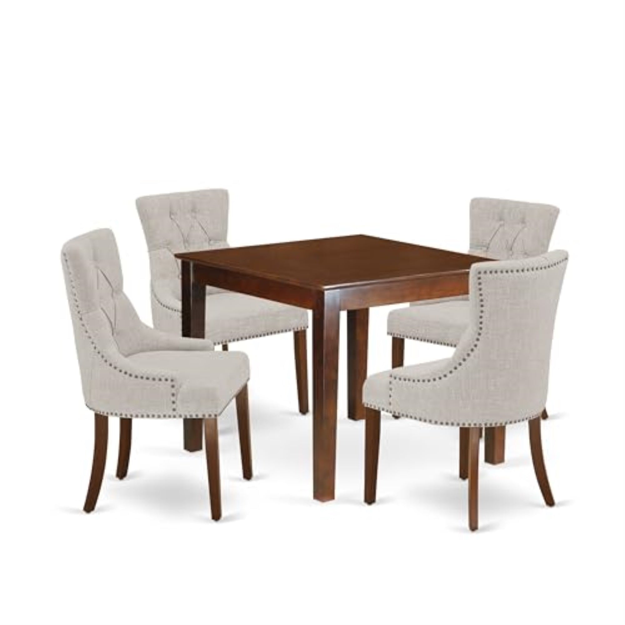 Oxfr5-Mah-05 Oxfr5-Mah-05 5Pc Dining Set Includes A Square Dinette Table And Four Parson Chairs With Doeskin Fabric, Mahogany Finish, A Traditional Design Gets A Contemporary Update In This Stylish Oxfr5-Mah-05 Dinette Set. This Specific 5Pc Dinette Set Includes A Kitchen Table And Four Parson Chairs. The Fresh And Clean Lines Dominate The Cutting-Edge Design Of The Square Small Dining Table Of This Elegant Kitchen Set. To Complement The Dining Room Table'S Square Beveled Tabletop, The Mahogany Finish Gives You The Glimmer And Shadows On The Small Kitchen Table'S Legs With Various Contours And Ridges For An Antique Dining Room Table Set. Made Up Of Prime Quality Rubber Wood, The Table Is Stable And Offers A Sturdy Finish. No Heat Treated Pressured Wood Like Mdf, Particle Board Or Veneer Top Fabricated. A Regal And Affordable Parson Chair Offers A Touch Of Beauty To Any Dining Room And Provides A Sensible Seating Arrangements. The Upholstered Dining Chair Features A Beautiful Stitched Exterior. Tall Back, Linen Fabric, High-Density Foam Padding, Solid Hardwood Frame Construction, Comfortable, Durable And Attractive. Whether You Use This Kitchen Chair Is An Easy To Assemble And Stylish Answer To Your Seating Needs. The Standard Shape, Size And Design Makes The Dining Area Significantly Attractive. This Contemporary, Budget Friendly, Durable And Comfortable Dinette Set Can Be Good Choice If You Are Looking For A Great Dining Time Experience With Your Family Or Friends.Table Specifications:Material: Asian Hardwoodcolor: Mahoganydimensions: Length 36; Width 36; Height 30Weight Capacity: 300 Lbschair Specifications:Frame Material: Asian Hardwoodfabric: Linen Fabriccushion Material: Foamfabric Color: Doeskinleg Color: Mahoganydimensions: Length 21.5; Width 21; Height 36Weight Capacity: 300 Lbsincludes:1 X Square Table4 X Parson Chairn. B. : Hardware Package And Instruction Manual Is Located In/Under The Seat.