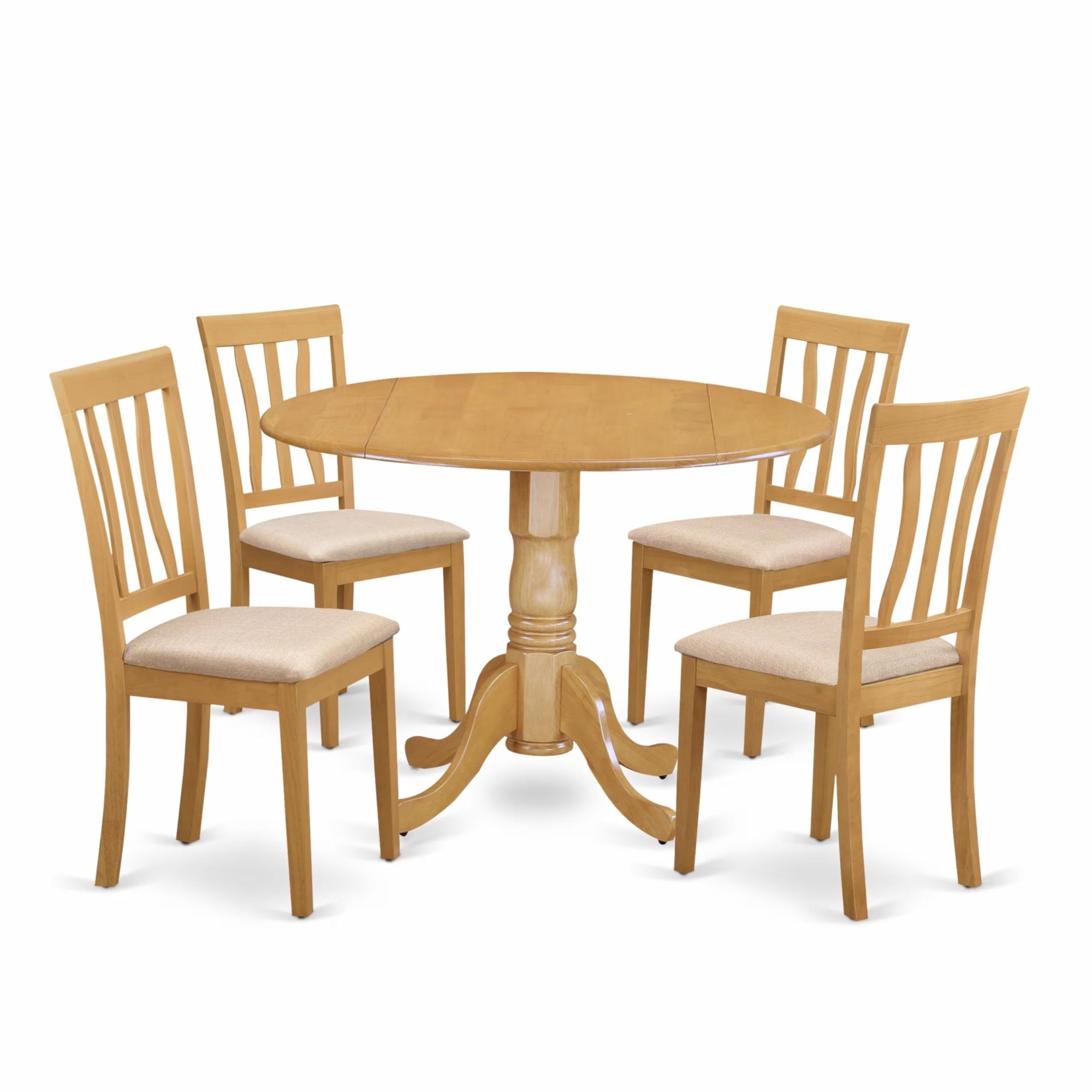 Casafoyer Dlan5-Oak-C 5 Piece Kitchen Table Set For 4 Includes A Round Dining Room Table With Dropleaf And 4 Linen Fabric Upholstered Dining Chairs, 42X42 Inch, Oak
