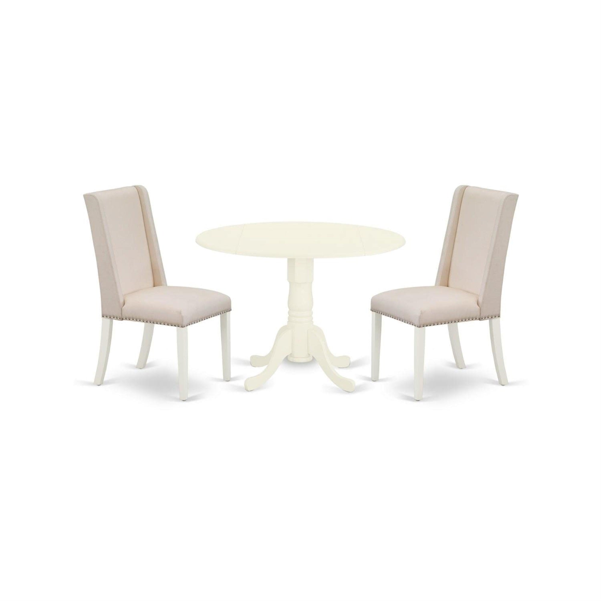 Casafoyer Dublin 3 Piece Kitchen Set Contains A Round Dining Room Table With Dropleaf And 2 Cream Fabric Upholstered Chairs, 42X42 Inch, Linen White