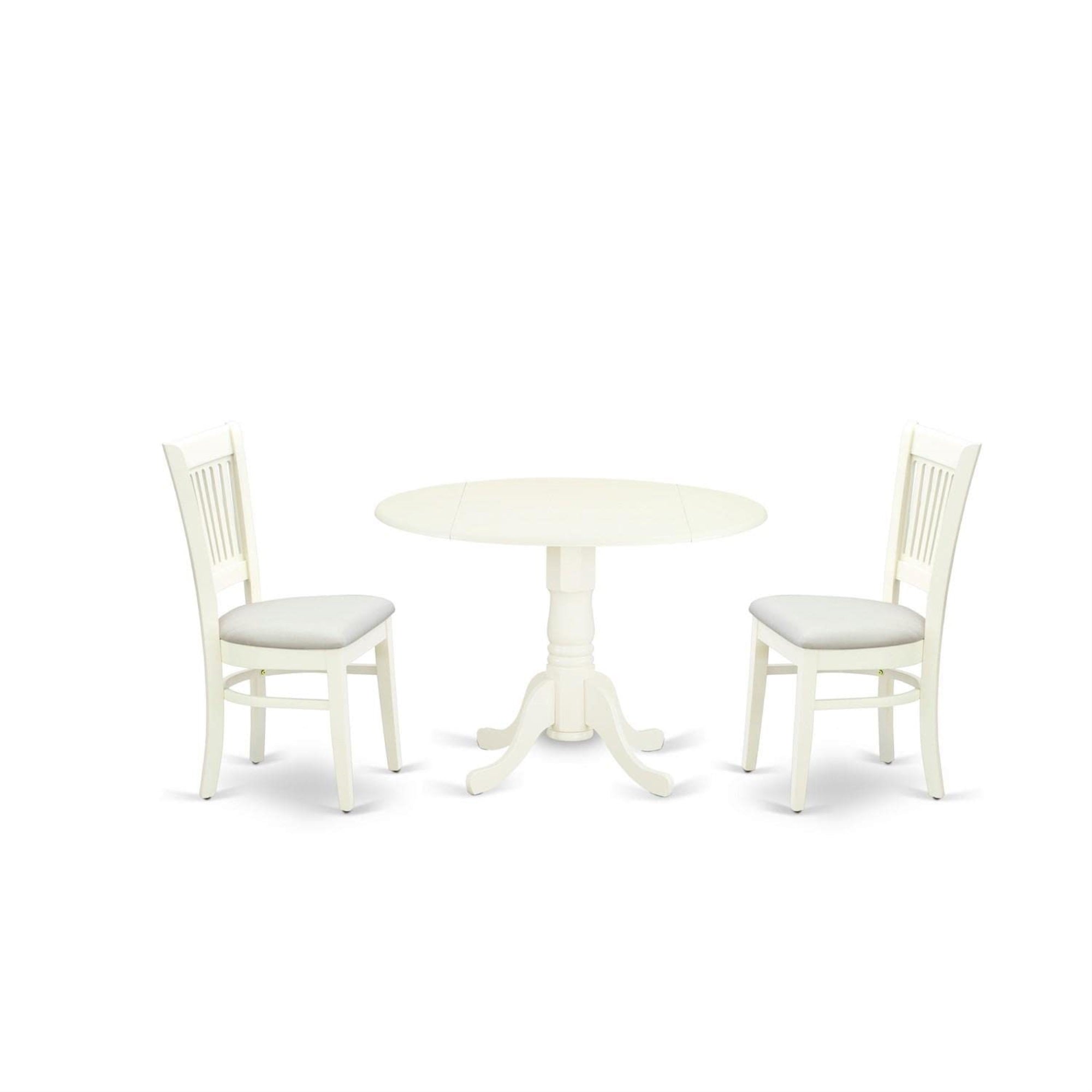Casafoyer Dublin 3 Piece Modern Set Contains A Round Wooden Table With Dropleaf And 2 Fabric Upholstered Dining Chairs, 42X42 Inch, Linen White