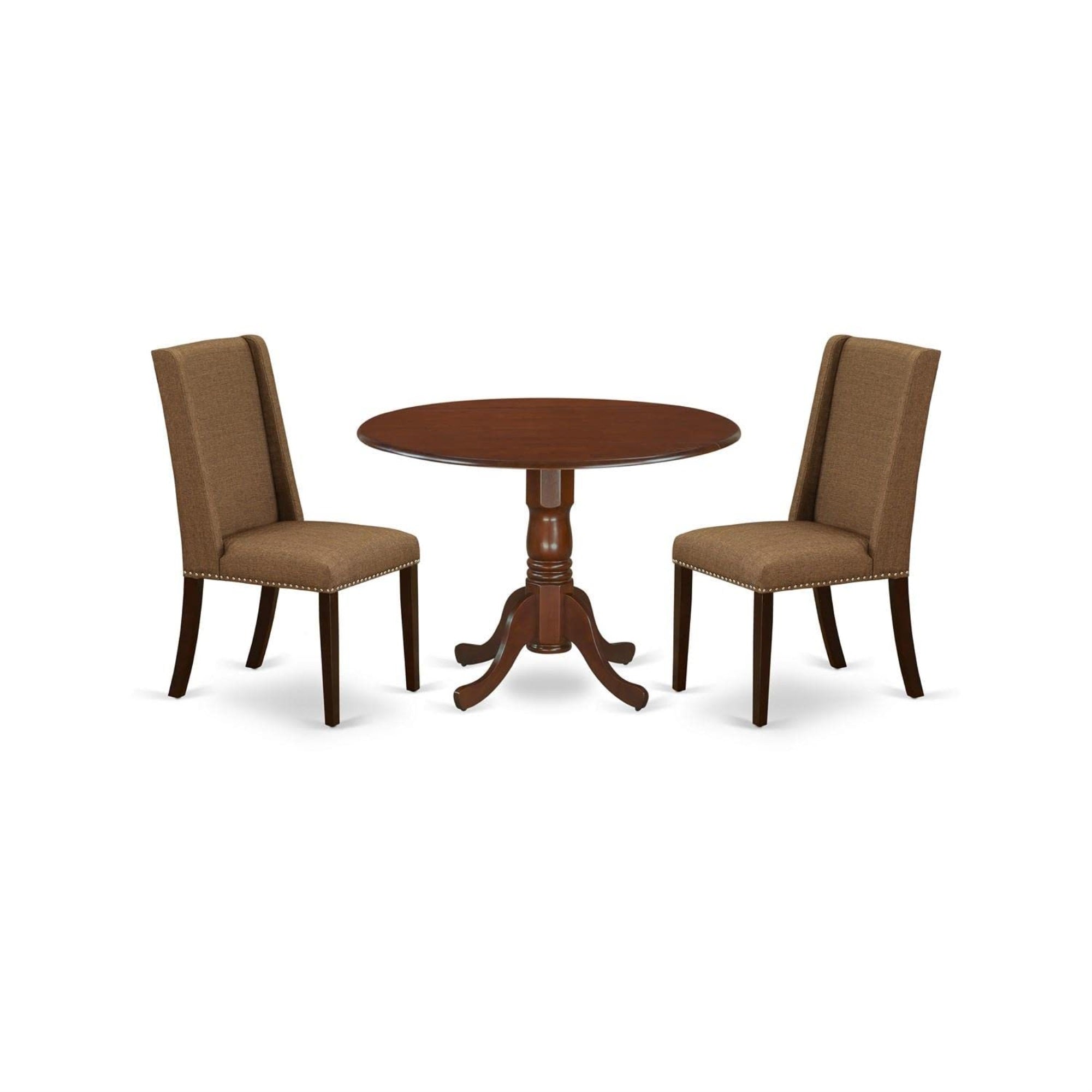 Casafoyer Dublin 3 Piece Set Contains A Round Dining Room Table With Dropleaf And 2 Brown Linen Fabric Upholstered Parson Chairs, 42X42 Inch, Mahogany