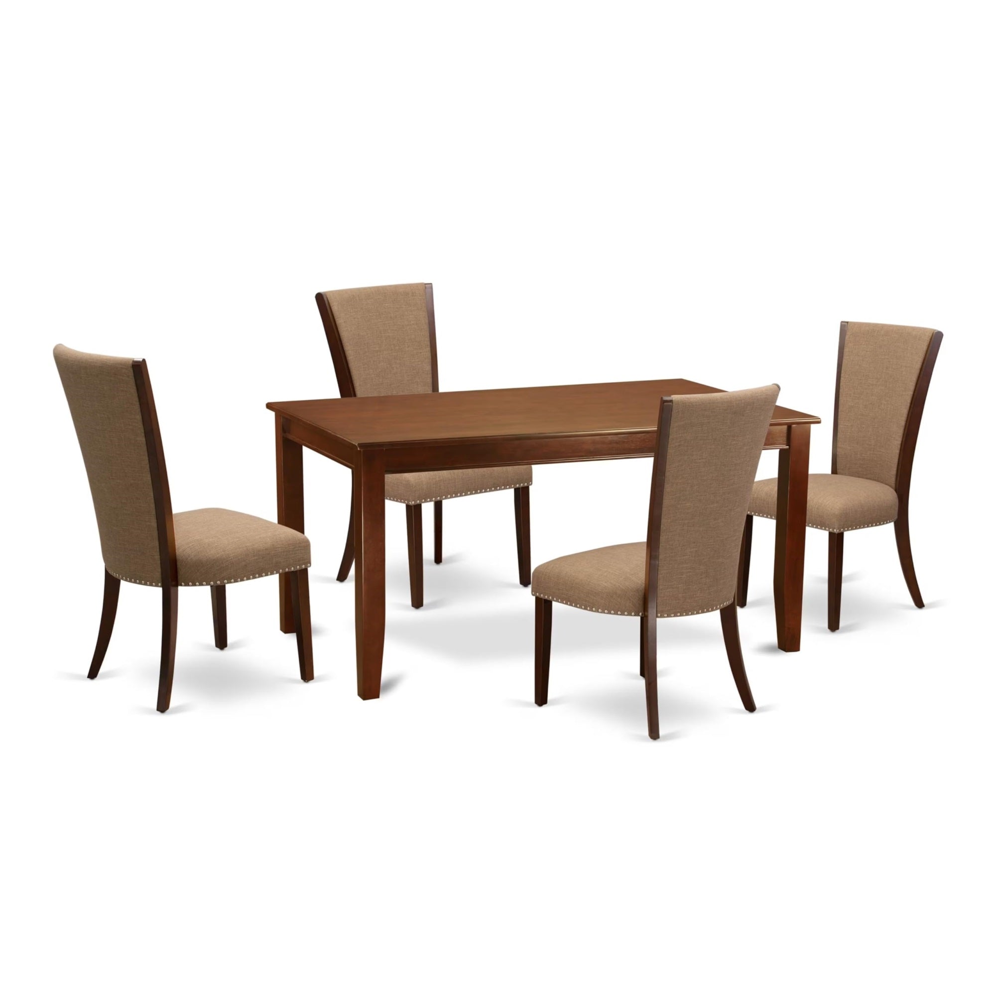 Duve5-Mah-47 East-West Furniture Duve5-Mah-47 - A Modern Dining Table Set Of 4 Great Kitchen Chairs Using Linen Fabric Light Sable Color And An Attractive Rectangle Kitchen Table In Mahogany Finish, East West Furniture Duve5-Mah-47 Of Four-Piece Parson Chairs With Linen Fabric Light Sable Color And An Eye-Catching Rectangle Kitchen Table With Mahogany Color.This Excellent Wood Table Can Provide The Outstanding Impression Of The Dining Style To Both Typical And Stylish Decoration. This Kitchen Dining Table Set Will Bring A Great Dose Of Charm To Your Dining Area. The Attractive Five-Piece Old Fashioned Dining Room Table Set Emphasizes Its Curves And Details, Giving An Otherwise Traditional Set A Little Modern Twist. The Body Of These Unique Indoor Dining Chairs And Mid Century Dining Table Is Made From Top Quality Asian Wood (Rubber Wood) Which Delivers Wonderful Sturdiness And Stability To These Dining Room Chairs And Modern Dining Table. Modern Sturdy Hardwood Structure, Comfortable Upholstered Seat, And Stylish Back, Reliable Modern Dining Table Offer Leading Edge Eyes To Your Kitchen, Wonderful Stability To This Excellent Wooden Dining Table Set, And Cozy Support To Your Back. Due To The Lightweight, This Modern Dining Table Set Is Super Easy To Carry, Clean, Assemble And Alter Its Places, Classic Styles Of This Special Rectangle Wooden Dining Table Meet Perfectly With Any Home Decor And A Smooth Oak Wooden Seat And Stylish Back Of These Parson Chairs Will Keep Users Comfortable.Chair Leg Wood Color: Mahoganychair Fabric Material: Linen Chair Fabricfabric Color: Light Sablerectangle Dining Table Color: Mahoganykitchen Chairs Dimensions: Length 24.7 X Width 20.25 X Height 39Wood Kitchen Table Dimensions: Length 60 X Width 36 X Height 30Package Includes: 4 Parson Dining Chairs And 1 Rectangle Kitchen Table