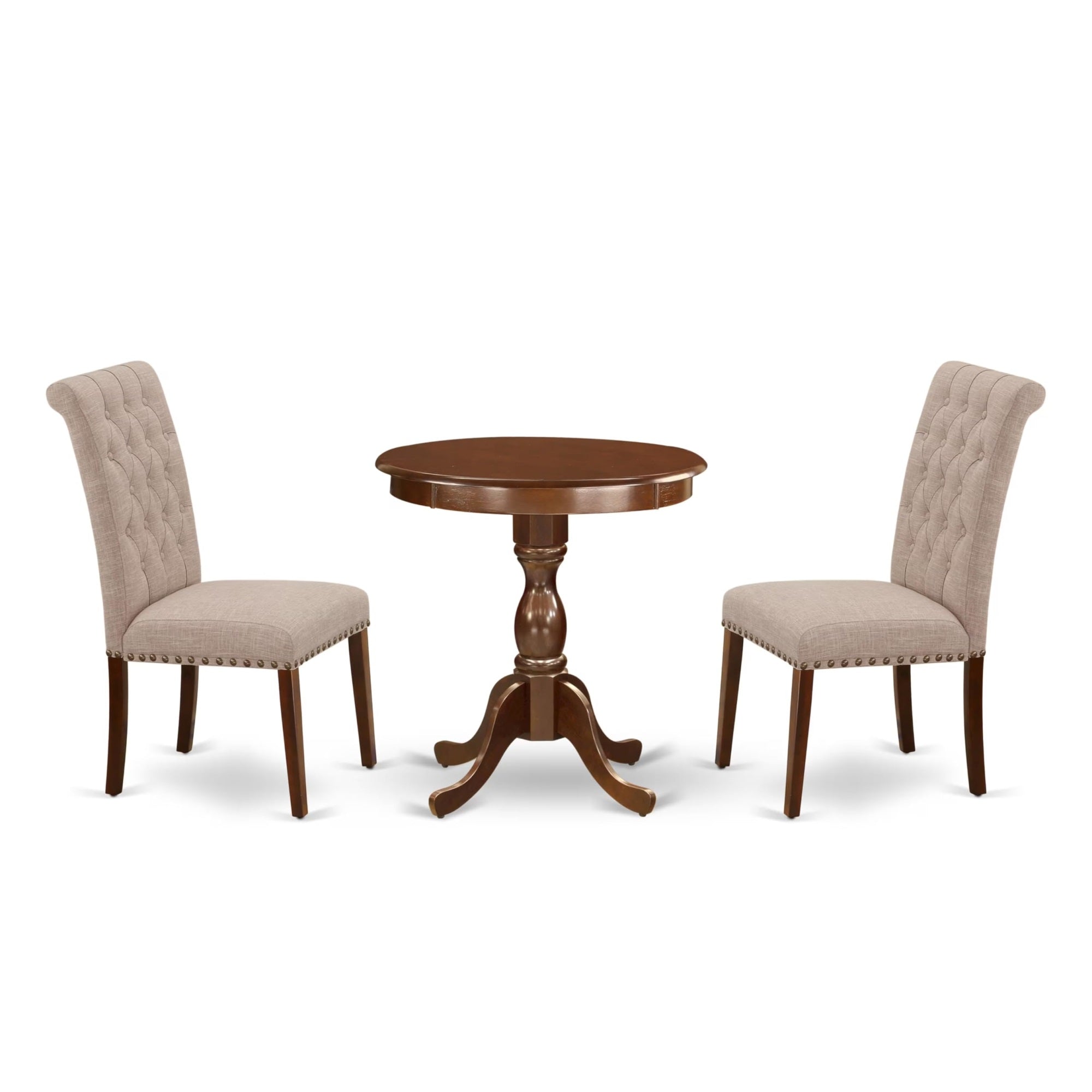 Casafoyer Esbr3-Mah-04 Eden 3 Piece Modern Set Contains A Round Wooden Table With Pedestal And 2 Light Tan Linen Fabric Parson Dining Chairs, 30X30 Inch, Mahogany