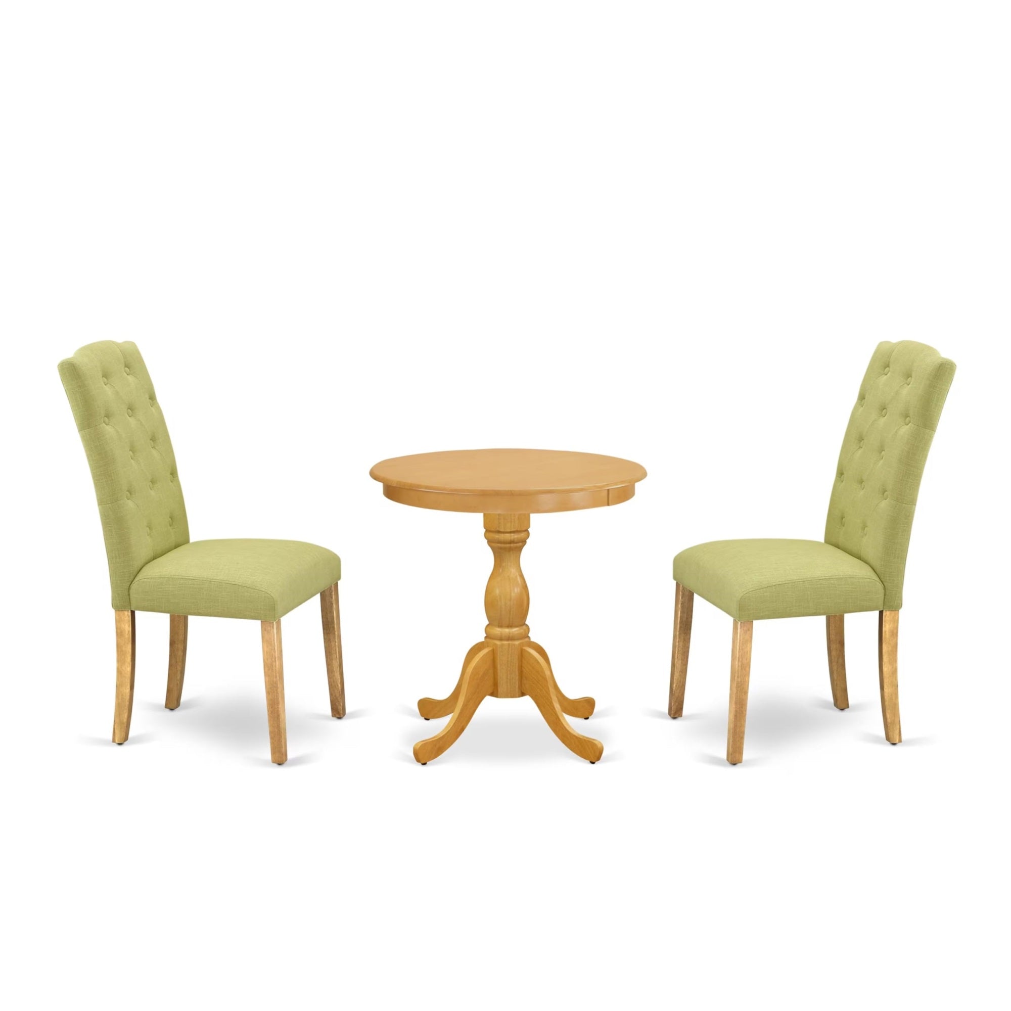 Esce3-Oak-07 East West Furniture - Esce3-Oak-07 - 3-Pc Modern Dining Set - 2 Parson Dining Room Chairs And 1 Dining Room Table (Oak Finish), East West Furniture - Esce3-Oak-07 - 3-Pc Dining Room Table Setits Kitchen Table Set Includes 2 Mid Century Kitchen Parson Chairs And 1 Modern Round Dining Table. This Dining Table Has A Round Table Top And Stunning Legs. The Hardwood Frame And Soft Padded Back Ensure That These Mid Century Dining Chairs Sturdiness And Offers Decent Support To Your Back, In Addition To Their Ideal Size These Urban Style Chairs Are Trouble Free To Construct And Easy To Rearrange. These Simple But Charming Dining Room Chairs Will Add Ambiance And Style To Your Dining Room. Provide Your Home A Pop Of Chic Style With This Must Have Kitchen Dining Set. A Contemporary Twist On A Classic Design, This Eye-Catching Dinette Set Design Will Liven Up Any Timeless Appeal. Just By Switching Out Your Chairs And Round Dining Table, You Can Effortlessly Refresh Your Dining Space. This Modern Dining Set Is Very Easy To Put Together. You Only Need Around 30 Minutes To Build This Dining Room Set. This Dining Table Set Comes With All The Necessary Hardware To Put Together This Dining Table Set. These Padded Parson Chairs Are Easy To Carry Or Move Around. Enjoy With East West Furniture!Features:Fabric: Linen Fabriccushion Material: Foamfabric Color: Limelightdining Table Top Color: Oakpadded Parson Chairs Dimensions Are: Length 23; Width 18; Height 40.Modern Kitchen Table Dimensions Are: Length 30; Width 30; Height 36.Included In The Package: 1 Stunning Wood Dining Table And 2 Stunning Padded Parson Chairs.