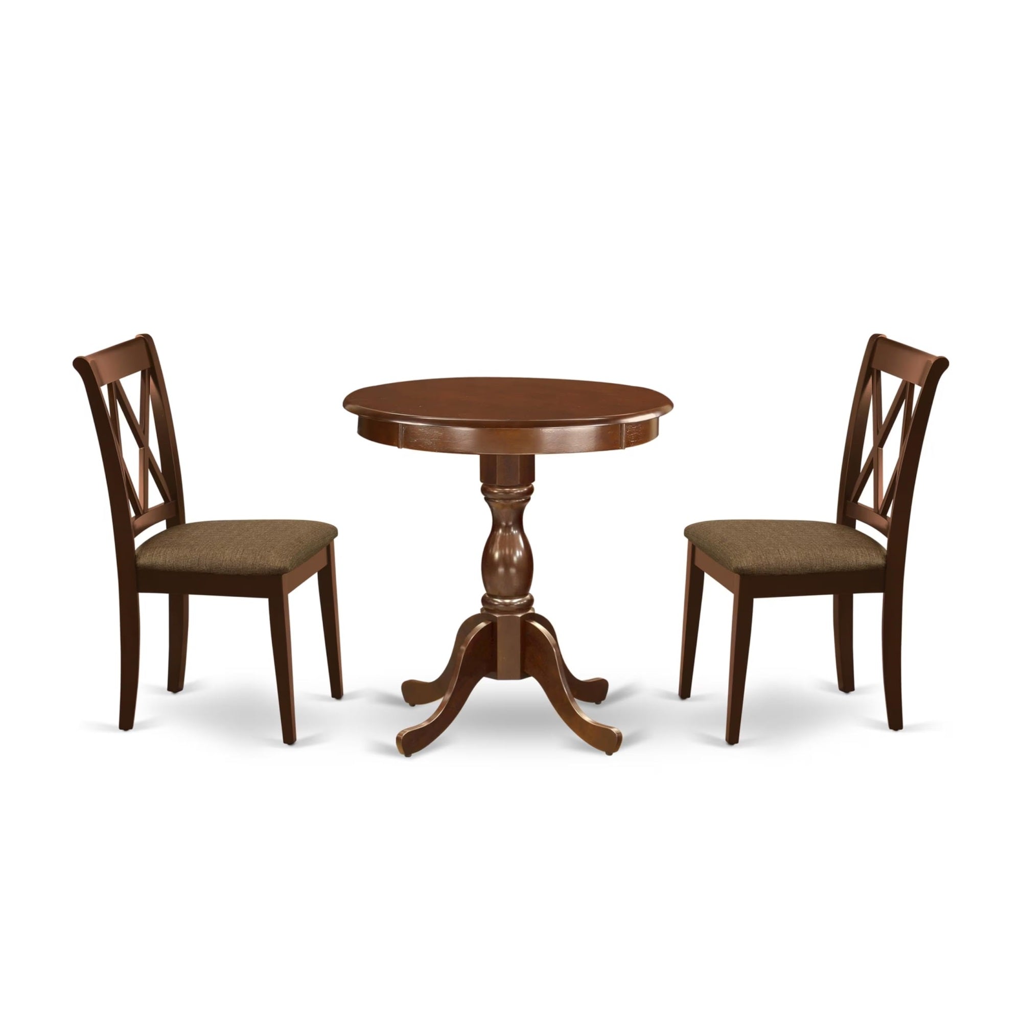 Casafoyer Escl3-Mah-C 3 Piece Dining Room Table Set Contains A Round Kitchen Table With Pedestal And 2 Linen Fabric Upholstered Dining Chairs, 30X30 Inch, Mahogany