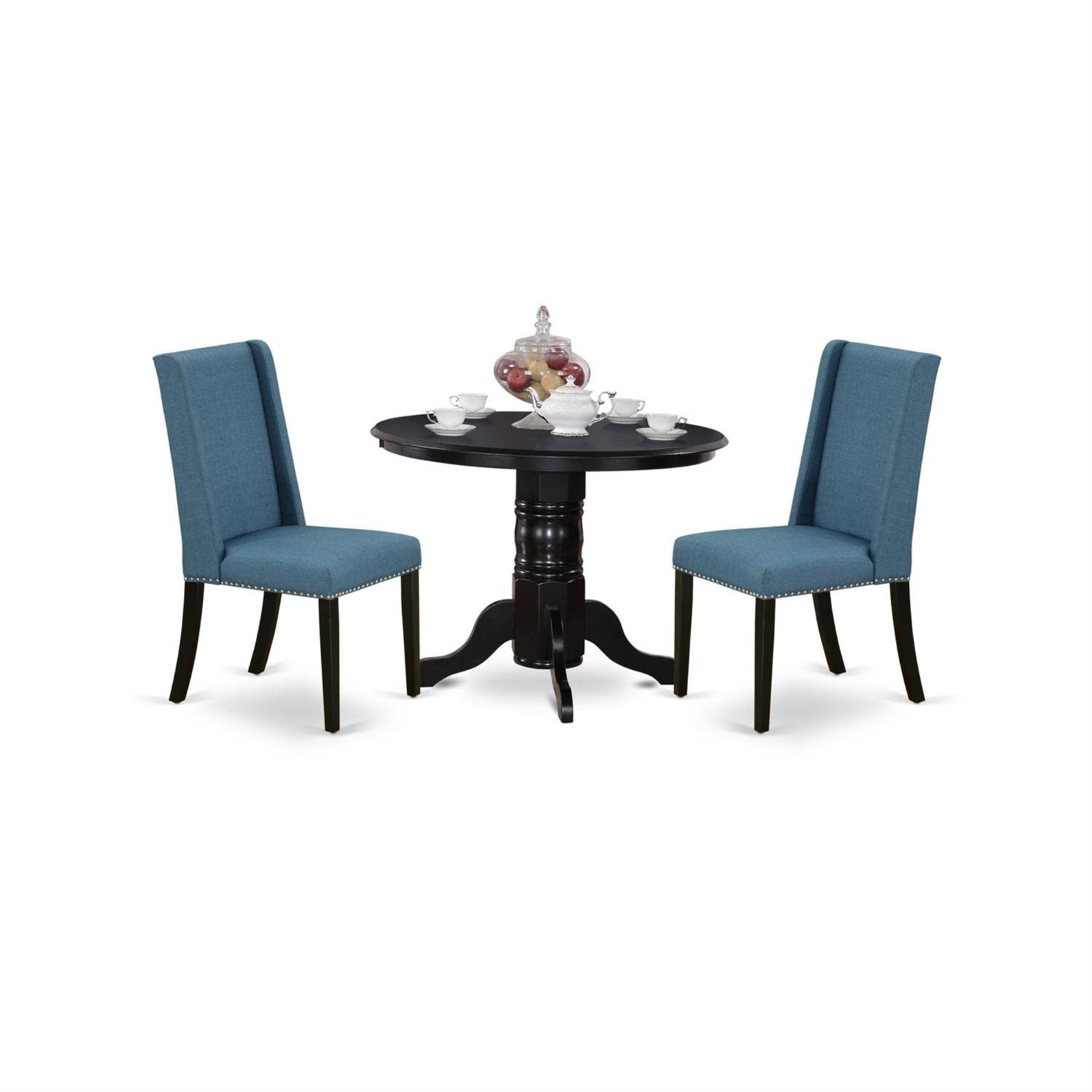 Casafoyer Shfl3-Blk-21 3 Piece Room Set Contains A Round Kitchen Table With Pedestal And 2 Blue Linen Fabric Parsons Dining Chairs, 42X42 Inch