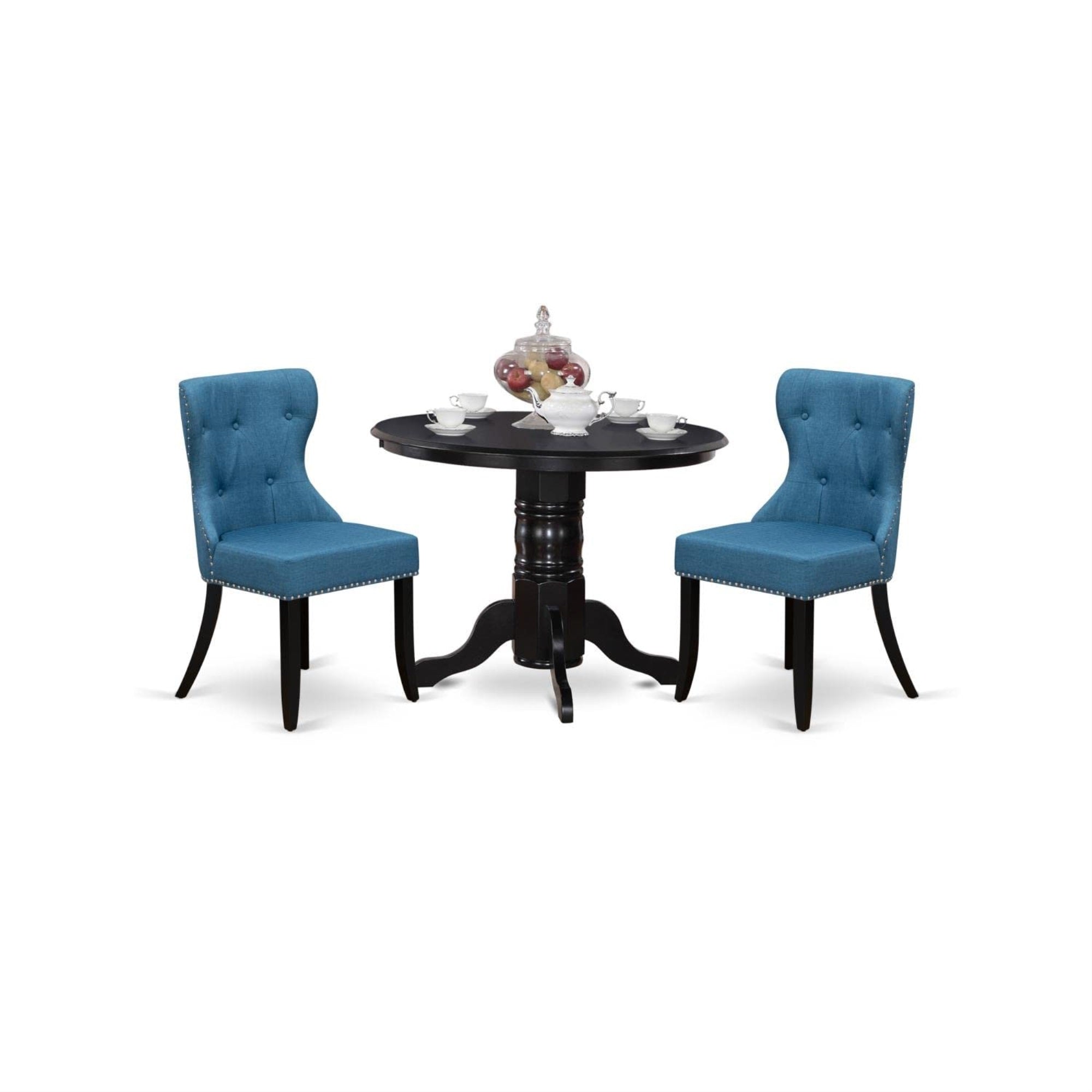 Shsi3-Blk-21 East-West Furniture Shsi3-Blk-21 - A Dining Room Table Set Of 2 Amazing Parson Dining Chairs With Linen Fabric Mineral Blue Color And A Lovely 42-Inch Antique Pedestal Kitchen Table Using Black Color, East West Furniture Shsi3-Blk-21 Of 2 Pieces Of Kitchen Chairs With Linen Fabric Mineral Blue Color And A Beautiful 42-Inch Antique Wooden Table With Black Colorthis Superb 42-Inch Antique Dining Table Can Deliver The Outstanding Impression Of The Dining Beauty To Both Typical And Stylish Decoration. This Wooden Dining Table Set Will Deliver A Wonderful Dose Of Beauty To Your Dining Area. The Beautiful Three Pieces Of Classic Dining Room Table Set Emphasizes Its Curves And Details, Giving An Otherwise Traditional Set A Little Modern Twist. The Body Of These Unique Kitchen Dining Chairs And Dining Table Is Created From Superior Quality Asian Wood (Rubber Wood) Which Delivers Fantastic Sturdiness And Stability To These Dining Chairs And Dining Table. Modern Sturdy Solid Wood Structure, Comfortable Upholstered Seat, And Stylish Back, Reliable Dining Table Offer Leading Edge Look To Your Kitchen, Fantastic Stability To This Outstanding Pedestal Kitchen Table Set, And Comfy Support To Your Back. With The Lightweight, This Dining Table Set Is A Breeze To Carry, Clean, Assemble And Alter Its Places, Classic Styles Of This Special Pedestal Kitchen Table Meet Perfectly With Any Home Decor And A Smooth Oak Wooden Seat And Stylish Back Of These Parson Dining Chairs Will Keep Users Comfortable.Chair Leg Wood Color: Blackchair Fabric Material: Linen Chair Fabricfabric Color: Mineral Blue42-Inch Antique Pedestal Kitchen Table Color: Blackparson Chairs Dimensions: Length 21.5 X Width 19.5 X Height 35.542-Inch Antique Pedestal Kitchen Table Dimensions: Length 42 X Width 42 X Height 30Package Includes: 2 Kitchen Dining Chairs And A 42-Inch Antique Wooden Table