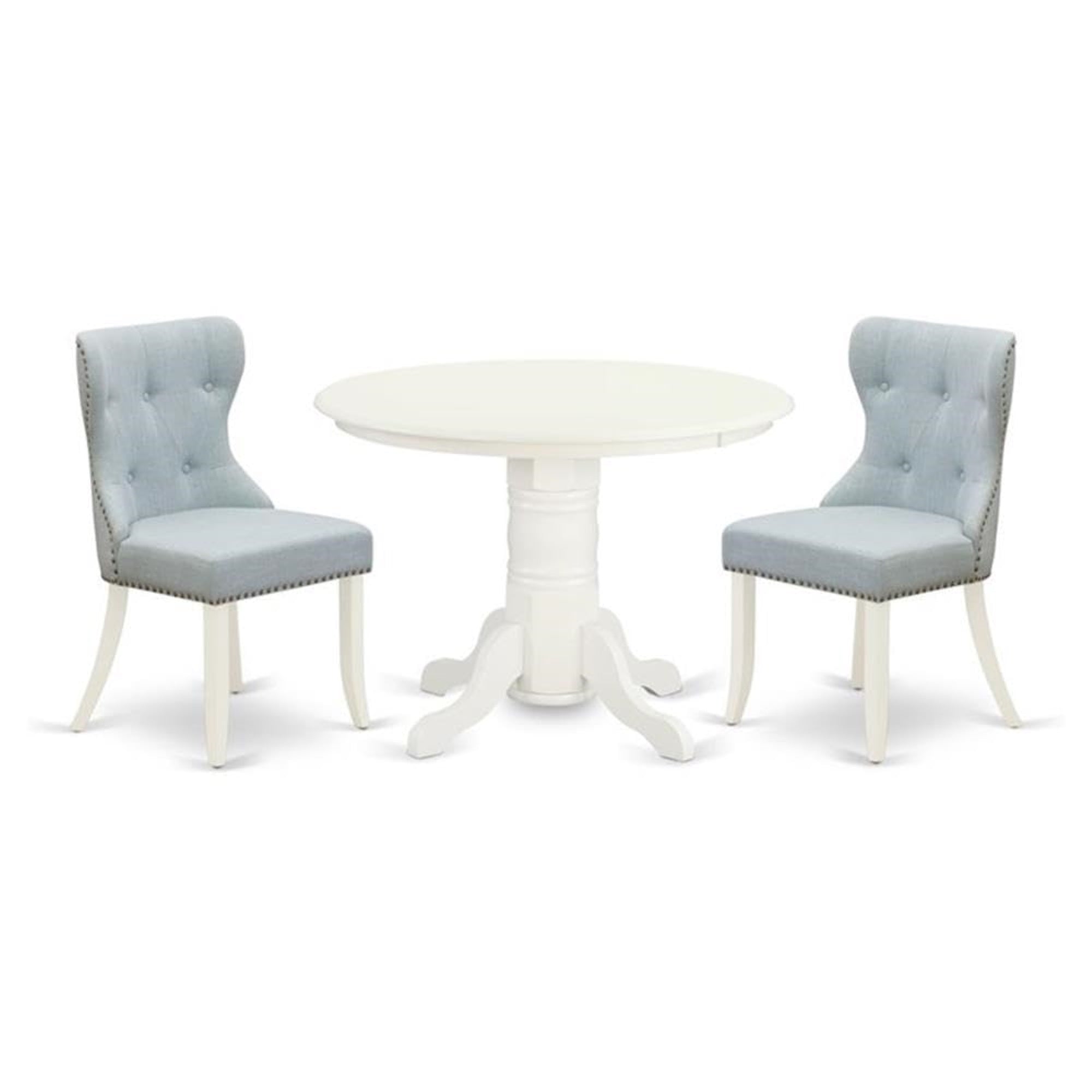 Casafoyer Shsi3-Whi-15 3 Piece Dining Room Table Set Contains A Round Wooden Table With Pedestal And 2 Baby Blue Linen Fabric Upholstered Chairs, 42X42 Inch, Linen White