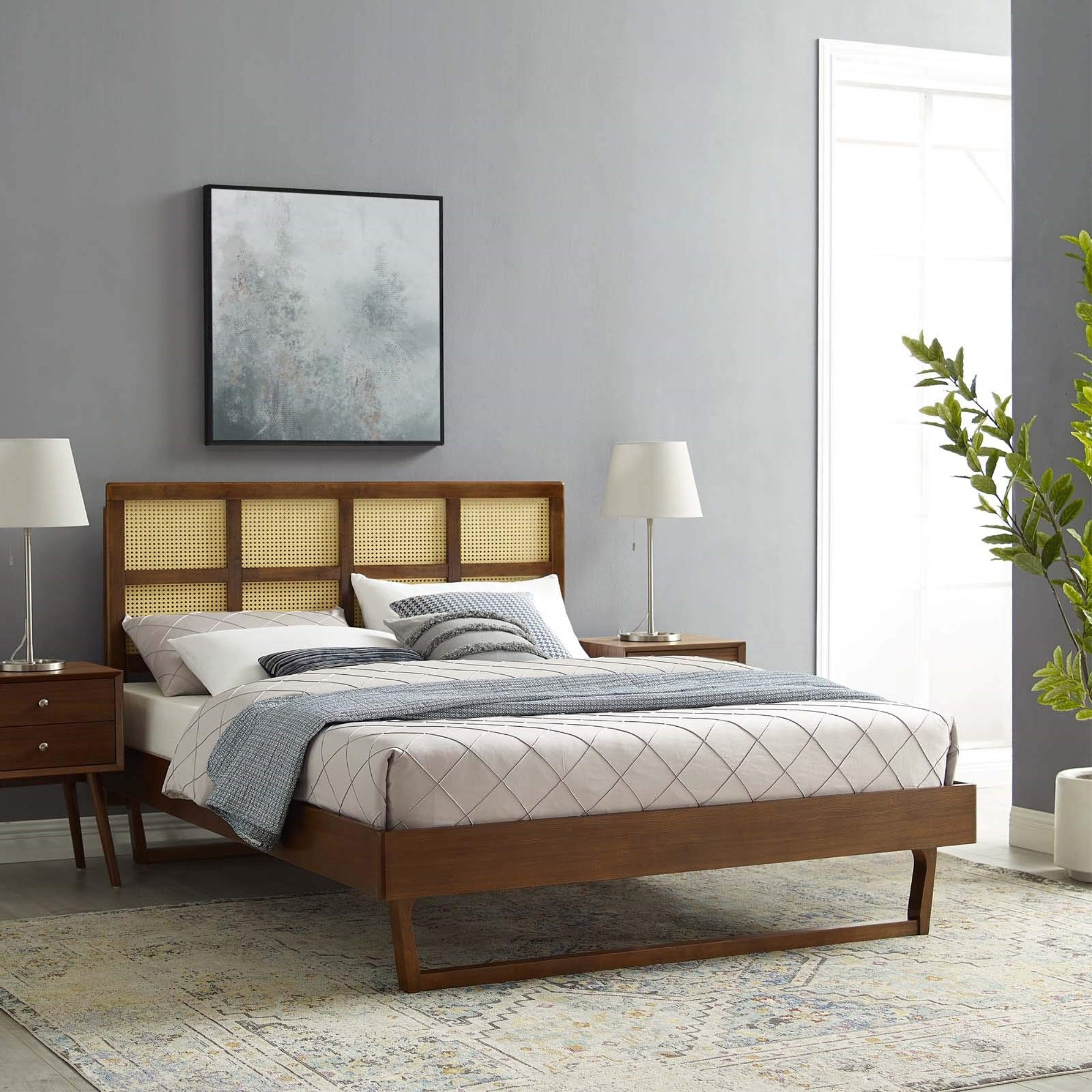 Casafoyer Sidney Cane Rattan And Wood King Platform Bed In Walnut With Angular Legs