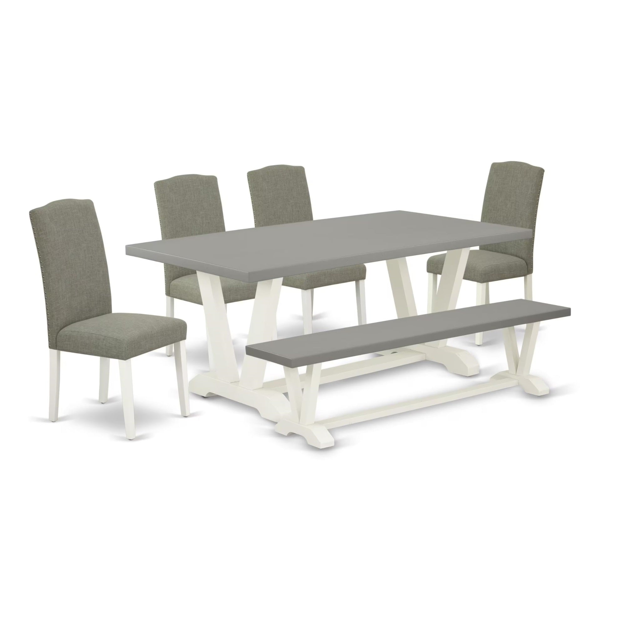 V097En206-6 East West Furniture 6-Piece Gorgeous Dinette Set A Great Cement Color Wood Table Top And Cement Color Small Bench And 4 Wonderful Linen Fabric Dining Chairs With Nail Heads And Stylish Chair Back, Linen White Finish, East West Furniture 6-Pc Rectangular Table Set With 4 Modern Dining Chairs - Indoor Bench And Kitchen Rectangular Tablethis Rectangular Table Set Includes 4 Gorgeous Kitchen Chairs, An Amazing Dining Room Bench, And A Wonderful Rectangular Table. This Dining Table Is Offered In An Elegant Linen White Finish. In Addition, The Parson Dining Room Chairs In A Dark Shitake Linen Fabric And Amazing Cement Dining Room Bench Top To Enhance The Elegance Of Any Kitchen Or Dining Area. Our Dining Room Set Delivers Great Durability Because This Kitchen Table And Wooden Bench Is Built From High Quality Asian Wood Which Can Bear The Weight Of 300 Lbs. We Have Created These Dining Room Chairs And Dining Table, Mid Century Modern Bench With The Help Of Highly Experienced Carpenters, Who Generate A Smooth And High-End Finish To This Dining Room Set. We Try To Offer Innovative As Well As Easy To Assemble Products. Our High-Quality Dining Room Set Is Perfect For You And Your Beautiful Dining Room As Well As The Kitchen Area. You Can Use It For Casual Home Parties Or Intimate Gatherings. Keep Enjoying East West Modern Furniture!Features:Color Of Parson Dining Chairs: Dark Shitakecolor Of Kitchen Rectangular Table Top: Cementcolor Of Modern Dining Table Base: Linen Whitecolor Of Wooden Bench Top: Cementcolor Of Wood Bench Base: Linen Whiterectangular Table Dimensions: Length 72; Width 40; Height 30Dining Room Chairs Dimensions: Length 23; Width 18; Height 40Dining Bench Dimensions: Length 72; Width 15; Height 18Package Include: 4 Kitchen Chairs And A Rectangular Dining Table And An Attractive Wood Bench