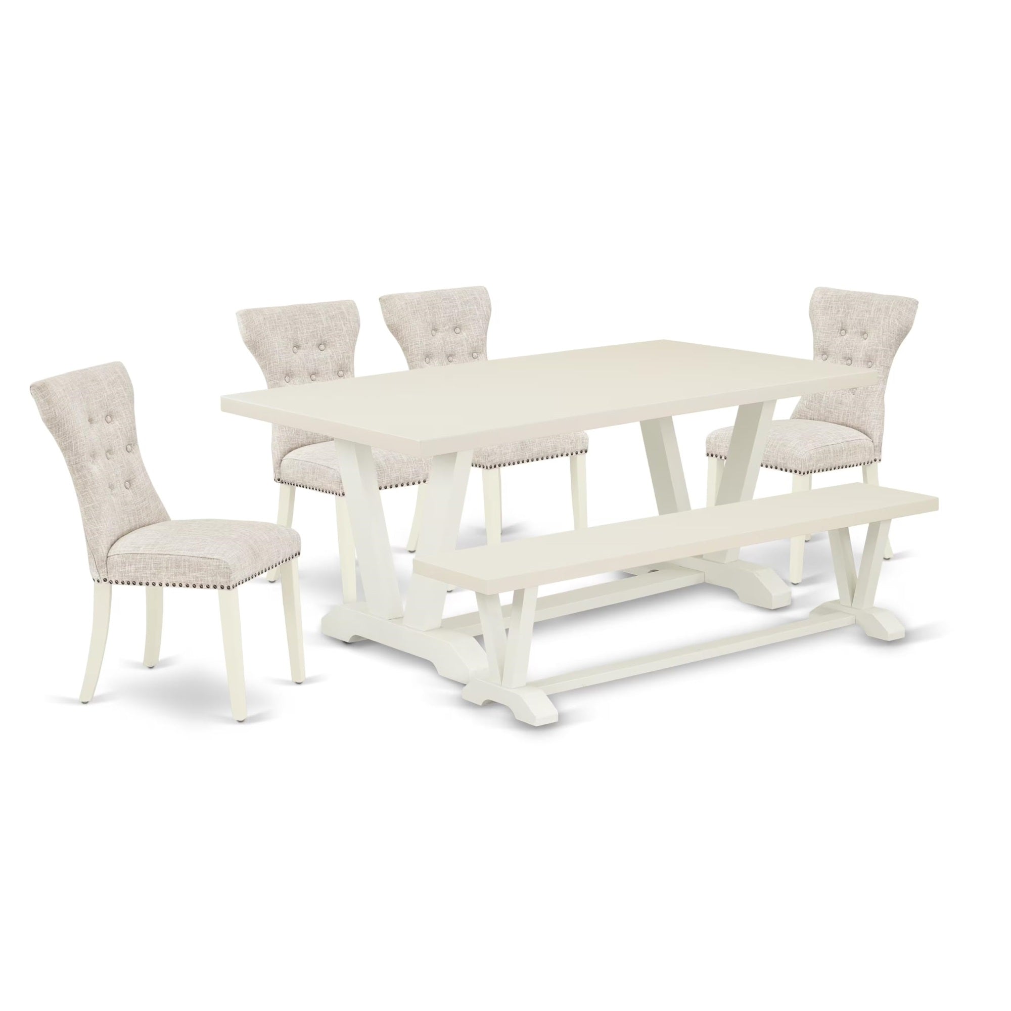 V027Ga235-6 East West Furniture 6-Pc Dining Room Table Set- 4 Parson Dining Chairs With Doeskin Linen Fabric Seat And Button Tufted Chair Back - Rectangular Top & Wooden Legs Dining Table And Wooden Dining Bench - Linen White Finish, East West Furniture 6-Piece Modern Dining Table Set- 4 Fantastic Dining Room Chairs, 1 Dining Room Table And Kitchen Table Benchthis 6-Pc Dining Room Table Set Includes 4 Upholstered Dining Chairs, 1 Rectangular Dining Table And Wood Bench. These Dining Chairs Have A Linen Fabric Seat, Button Tufted Chair Back, And The Breakfast Table Includes A Rectangular Top And Wooden Legs. The Kitchen Chairs Seat, The Chair Back Is Made Of Linen Fabric In A Doeskin Color Parson Chairs Hardwood Structure, And The Linen Fabric Seat Is Quite Easy To Clean. You Can Clean Dust Easily And Frequently To Save Time By Using A Damp Cloth. These Dining Padded Chairs And The Rectangular Dining Table Is The Perfect Choice For Your Dining Room Or Kitchen. The Quick Frame Of The Dining Padded Chairs And The Dining Room Table As Well As Screws Of The Same Size That Allow Simple And Fast Setup.Features:Dining Room Set Material: Asian Hardwoodseating Material: Linen Fabricwooden Dining Table And Dining Room Bench Top Color: Linen Whiterectangular Dining Table And Mid Century Modern Bench Legs Color: Wire Brushed Linen Whitepadded Parson Chair Legs Color: Linen Whitedining Room Chairs Fabric Color: Doeskindining Room Table Dimensions: Length 72; Width 40; Height 30.Padded Parson Chair Dimensions: Length 19; Width 25; Height 41.Small Bench Dimensions: Length 72; Width 15; Height 18.Included In The Package: One Awesome Modern Kitchen Table, A Wood Bench And 4 Awesome Dining Chairs.