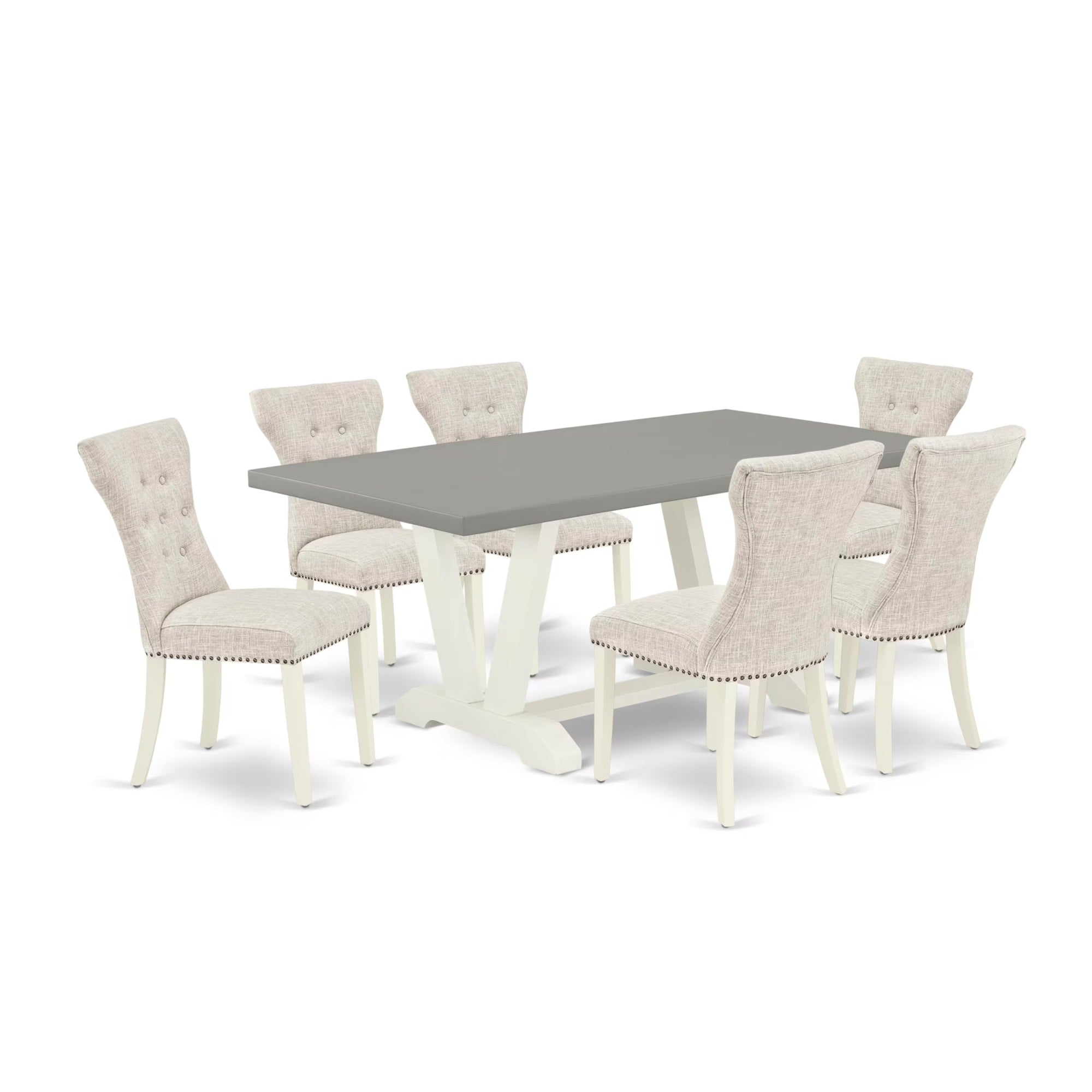 V097Ga235-7 East West Furniture 7-Piece Dining Room Set- 6 Mid Century Dining Chairs With Doeskin Linen Fabric Seat And Button Tufted Chair Back - Rectangular Table Top & Wooden Legs - Cement And Linen White Finish, East West Furniture 7-Piece Kitchen Room Table Set- 6 Wonderful Parson Chairs And 1 Modern Kitchen Tablethe 7-Piece Dining Room Table Set Consists Of 6 Kitchen Parson Chairs And 1 Dining Table. These Dining Chairs Have A Linen Fabric Seat, Button Tufted Chair Back, And The Kitchen Table Is Consists Of A Rectangular Top And Wooden Legs. The Padded Parson Chair Seat And The Chair Back Is Created From Linen Fabric In A Doeskin Color Upholstered Dining Chairs Solid Wood Structure And The Linen Fabric Seat Is Very Easy To Clean. You Can Clean Dust Quite Simply And Frequently To Save Time By Using A Damp Cloth. These Upholstered Dining Chairs And The Dining Table Is The Ideal Choice For Your Dining Room Or Kitchen. The Easy Structure Of The Dining Chairs And The Kitchen Table As Well As Screws Of The Same Size That Allow Quick And Easy Setup.Features:Dining Room Table Set Material: Asian Hardwoodseating Material: Linen Fabricdining Room Table Top Color: Cementwood Dining Table Legs Color: Wire Brushed Linen Whitekitchen Parson Chairs Legs Color: Linen Whitedining Padded Chairs Fabric Color: Doeskinwood Dining Table Dimensions: Length 72; Width 40; Height 30.Upholstered Dining Chairs Dimensions: Length 19; Width 25; Height 41.Included In The Package: The Awesome Modern Kitchen Table And 6 Awesome Dining Room Chairs.