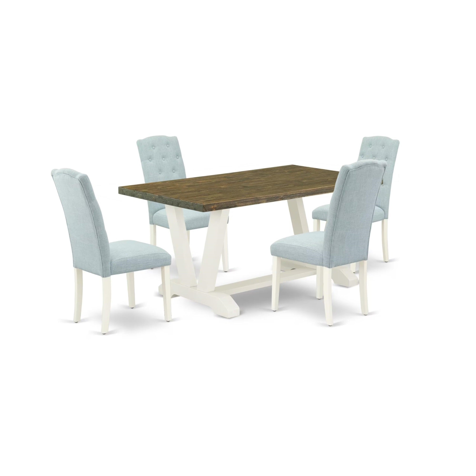 Casafoyer V076Ce215-5 5 Piece Modern Dining Table Set Includes A Rectangle Wooden Table With V-Legs And 4 Baby Blue Linen Fabric Parson Dining Chairs, 36X60 Inch, Multi-Color