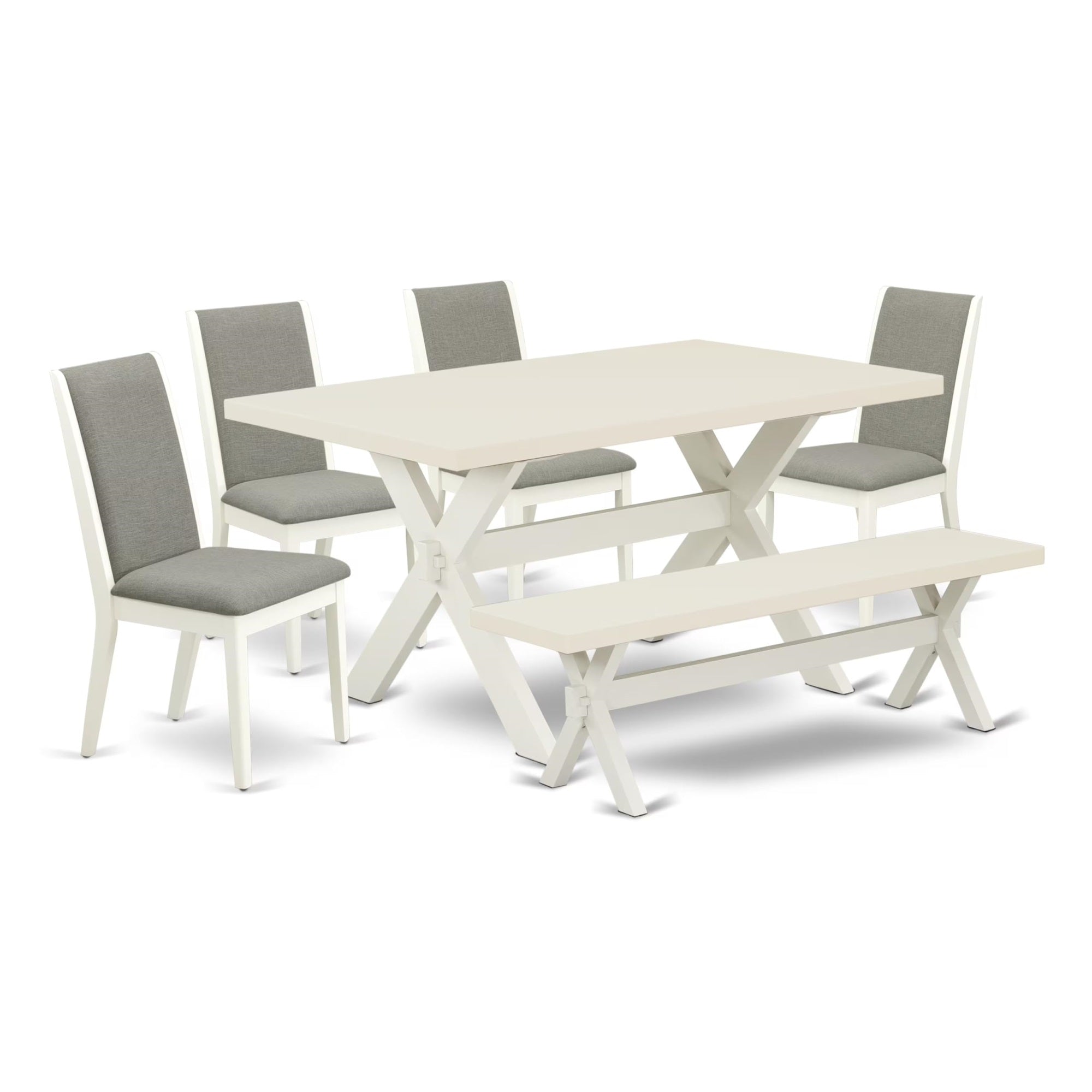 X026La206-6 East West Furniture X026La206-6 6-Piece Beautiful Dinette Set An Outstanding Linen White Dining Table Top And Linen White Indoor Bench And 4 Stunning Linen Fabric Parson Dining Room Chairs With Stylish Chair Back, Wire Brushed Black Finish, East West Furniture 6-Pc Kitchen Set With 4 Modern Dining Chairs - Kitchen Bench And Rectangular Wood Tablethis Rectangular Dining Room Table Set Includes 4 Awesome Parson Chairs, A Wonderful Small Bench, And An Outstanding Dining Table. This Wood Table Is Offered In An Elegant Linen White Finish. In Addition, The Dining Room Chairs In A Shitake Linen Fabric And Awesome Linen White Kitchen Bench Top To Enhance The Elegance Of Any Kitchen Or Dining Room. Our Kitchen Set Delivers Great Durability Because This Wood Table And Wooden Bench Is Built From High Quality Asian Wood Which Can Bear The Weight Of 300 Lbs. We Have Created These Kitchen Chairs And Dining Room Table, Dining Bench With The Help Of Highly Experienced Carpenters, Who Generate A Smooth And High-End Finish To This Rectangular Table Set. We Try To Offer Innovative As Well As Easy To Assemble Products. Our High-Quality Dinette Set Is Perfect For You And Your Beautiful Dining Area As Well As The Kitchen Area. You Can Use It For Casual Home Parties Or Intimate Gatherings. Keep Enjoying East West Modern Furniture!Features:Color Of Upholstered Dining Chairs: Shitakecolor Of Modern Dining Table Top: Linen Whitecolor Of Wood Table Base: Linen Whitecolor Of Mid Century Modern Bench Top: Linen Whitecolor Of Wooden Bench Base: Linen Whitedining Room Table Dimensions: Length 60; Width 36; Height 30Dining Room Chairs Dimensions: Length 24; Width 20; Height 39Dining Bench Dimensions: Length 60; Width 15; Height 18Package Include: 4 Parson Chairs And A Kitchen Rectangular Table And A Gorgeous Dining Room Bench