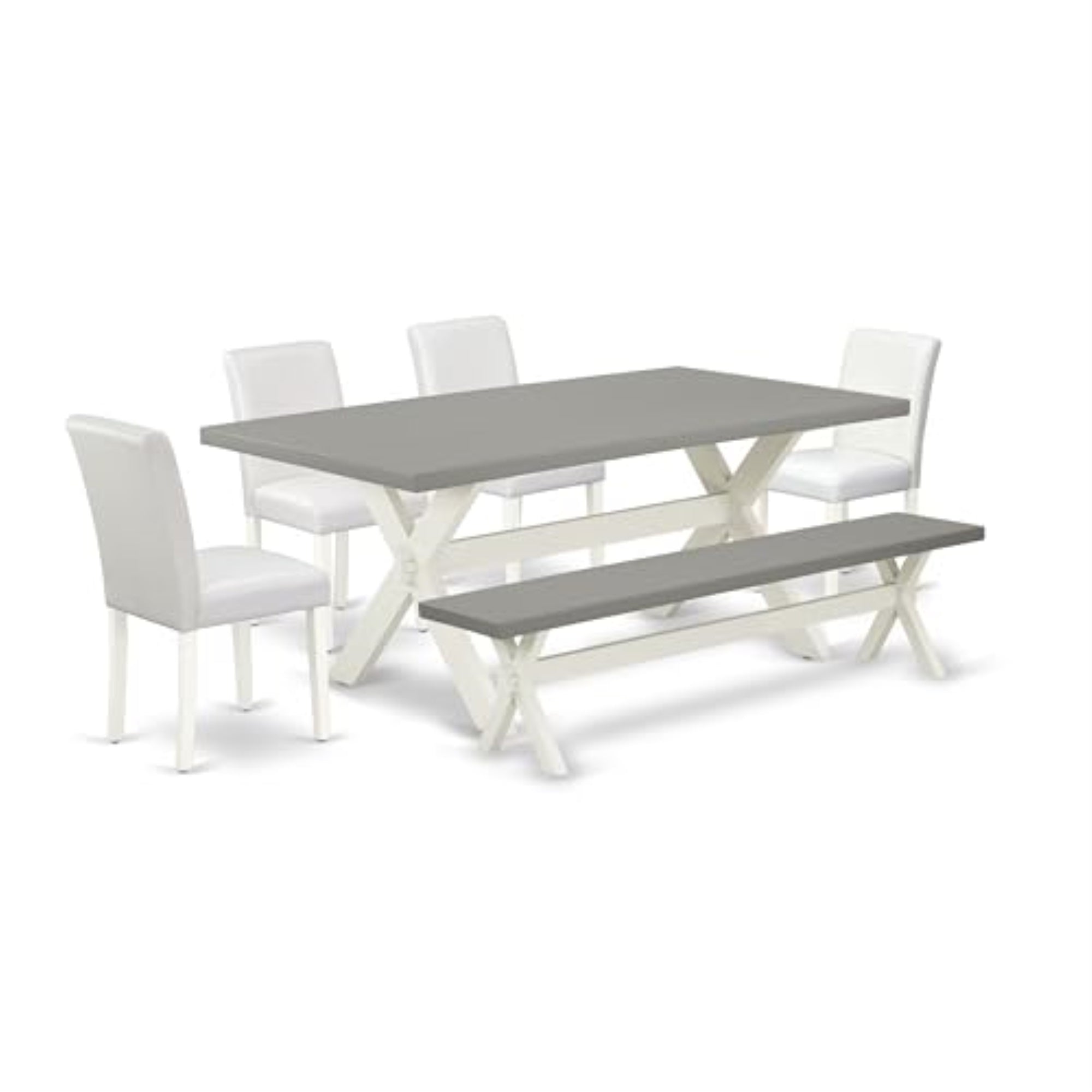X097Ab264-6 East West Furniture X097Ab264-6 6-Piece Stylish Modern Dining Table Set Of High Quality Cement Color Wood Dining Table Top And Cement Color Wood Bench And 4 Amazing Pu Leather Padded Parson Chairs With Stylish Chair Back, Linen White Finish, East West Furniture 6-Piece Kitchen Set With 4 Modern Dining Chairs - Kitchen Bench And Rectangular Wood Tablethis Dining Set Includes 4 Wonderful Padded Parson Chairs, An Awesome Kitchen Bench, And An Amazing Kitchen Rectangular Table. This Dining Table Is Offered In An Elegant Linen White Finish. Also, The Modern Dining Chairs In A White Finish Pu Leather And Wonderful Cement Kitchen Bench Top To Enhance The Elegance Of Any Kitchen Or Dining Area. Our Modern Dining Table Set Delivers Great Durability Because This Dining Table And Wooden Bench Is Built From High Quality Asian Wood Which Can Bear The Weight Of 300 Lbs. We Have Created These Dining Room Chairs And Kitchen Rectangular Table, Wood Bench With The Help Of Highly Experienced Carpenters, Who Generate A Smooth And High-End Finish To This Dinette Set. We Try To Offer Innovative As Well As Easy To Assemble Products. Our High-Quality Dining Table Set Is Perfect For You And Your Beautiful Dining Room As Well As The Kitchen Area. You Can Use It For Casual Home Parties Or Intimate Gatherings. Keep Enjoying East West Modern Furniture!Features:Color Of Parson Dining Room Chairs: Whitecolor Of Dining Room Table Top: Cementcolor Of Kitchen Rectangular Table Base: Linen Whitecolor Of Dining Bench Top: Cementcolor Of Mid Century Modern Bench Base: Linen Whitedining Table Dimensions: Length 72; Width 40; Height 30Parson Dining Chairs Dimensions: Length 21; Width 17; Height 35Dining Bench Dimensions: Length 72; Width 15; Height 18Package Include: 4 Dining Chairs And A Kitchen Rectangular Table And A Wonderful Indoor Bench
