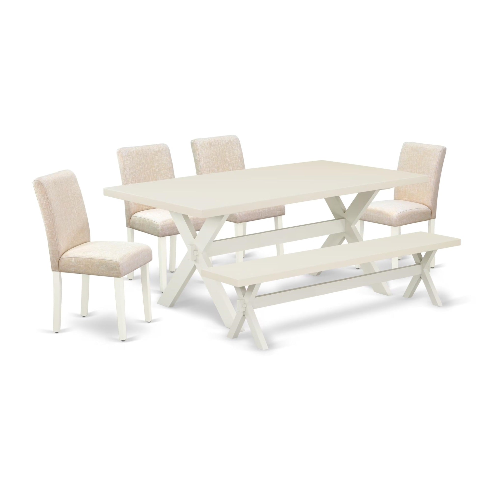 Casafoyer X027Ab202-6 6 Piece Dining Set Contains A Rectangle Dining Room Table With X-Legs And 4 Light Beige Linen Fabric Parson Chairs With A Bench, 40X72 Inch, Multi-Color