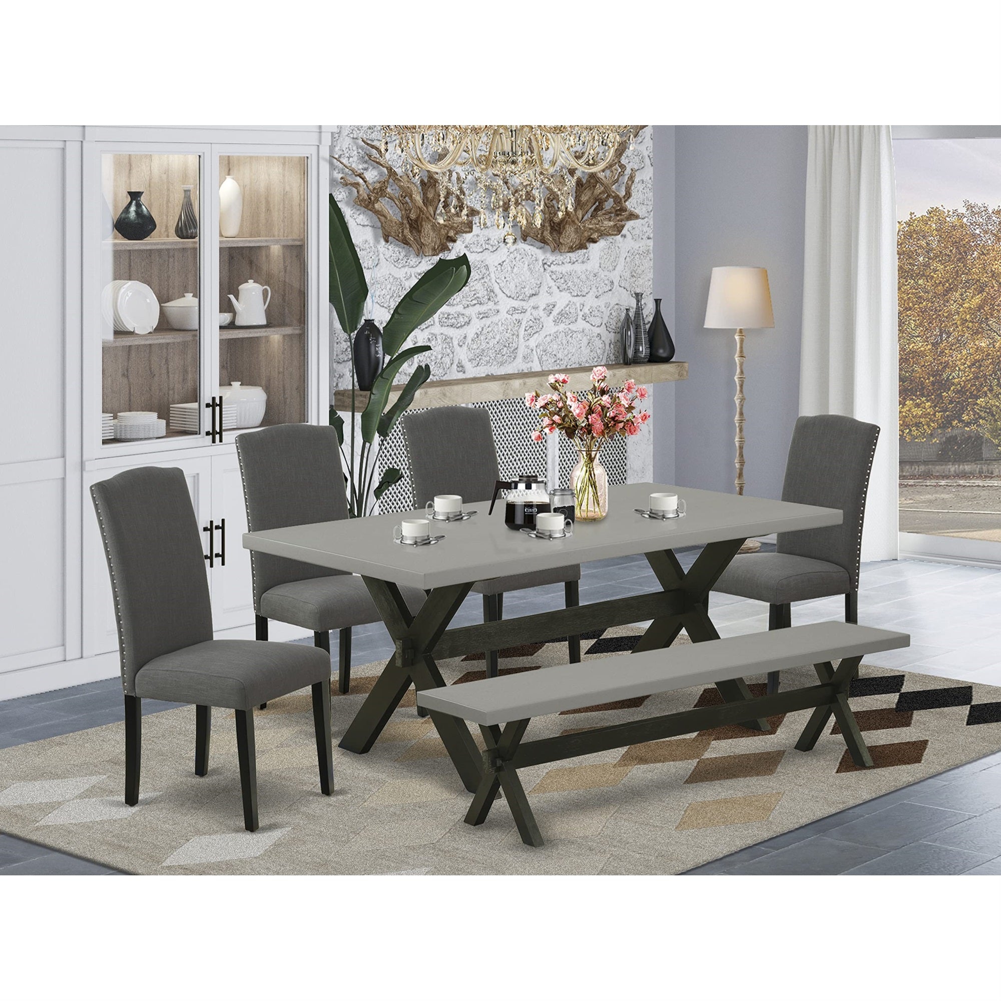 Casafoyer X697En120-6 6-Piece Dining Table Set - A Superb Dining Table And A Gorgeous Bench - 4 Lovely Parson Chairs Nail Heads And High Back (Cement & Wire Brushed Black Finish)