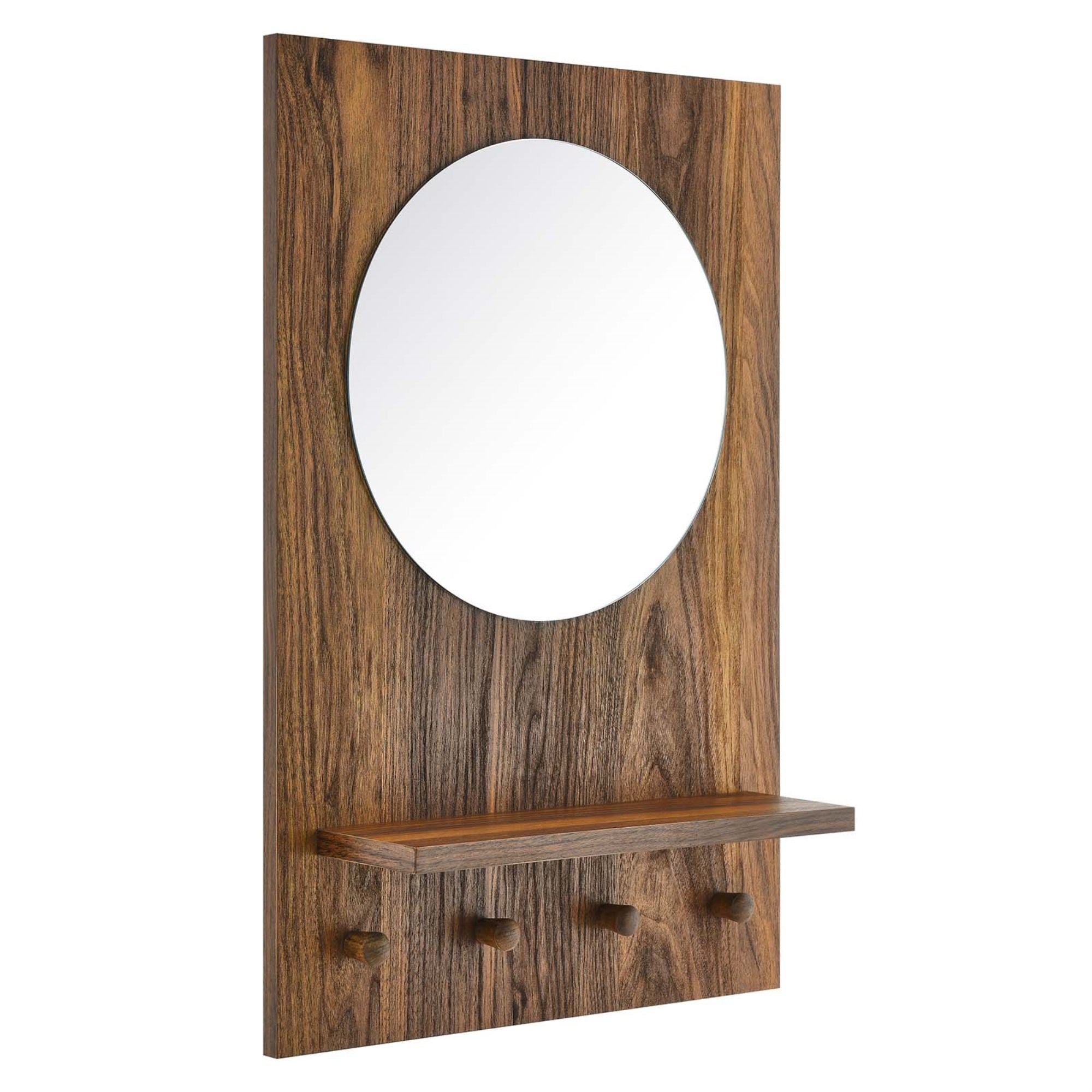 A Good Combination Of Form And Function, Glint Is A Stunning Round Mirror With A Rectangular Wood Frame, Shelf, And Four Pegs, And Is A Must-Have For The Entryway, Hallway, Or Mudroom. Not Only Does It Offer A Touch Of Modern Style And Elegance, But It Also Provides Organization And Storage For Keys, Dog Leashes, Hats, And A Variety Of Other Small Items. Crafted From Mindi Wood And Particleboard With A Wood Grain Laminate, This All-In-One Wall Mirror Is Made To Last And Brings An Extra Touch Of Character To Any Home Or Apartment. Its Sleek, Modern Design And Wood Grain Aesthetics Are Sure To Turn Heads And Make A Statement. Minimal Assembly Required. Set Includes: One - Glint Mirror