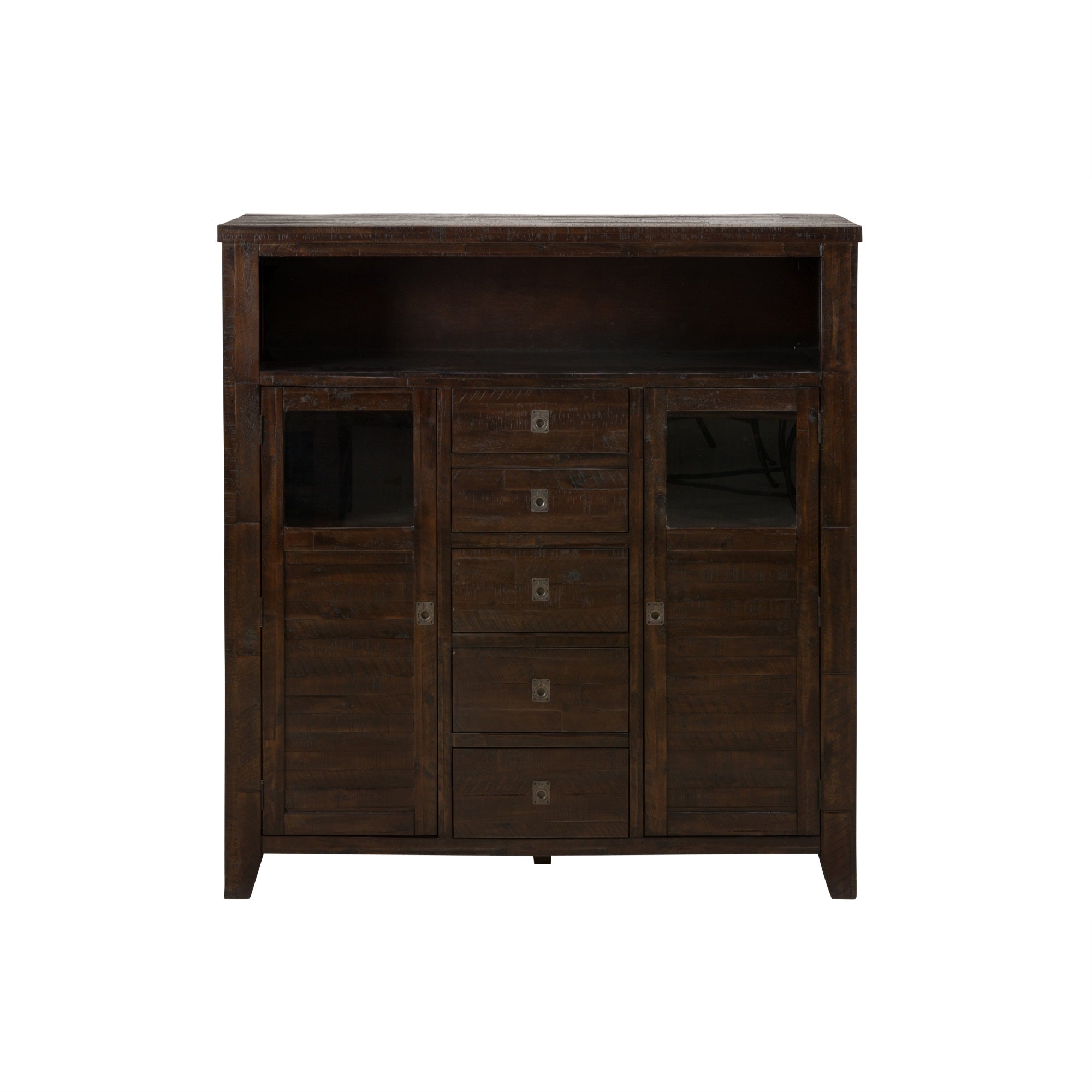 Perfect For Creating A Warm And Inviting Atmosphere In Your Kitchen Or Living Room, The Kona Grove Collection Has A Rich Dark Chocolate Brown Finish With Intentional Distressing That Adds Depth And Character To Any Space And Decor. Measuring 58' Tall And 55' Wide And Arriving Fully Assembled, This Storage Cabinet Is The Perfect Addition To Your Home With Five Storage Drawers With Uniquely Distressed Metal Hardware And Beautiful Solid Acacia Construction. Two Side Cabinets With Tempered Glass Doors Are Beautiful And Functional.