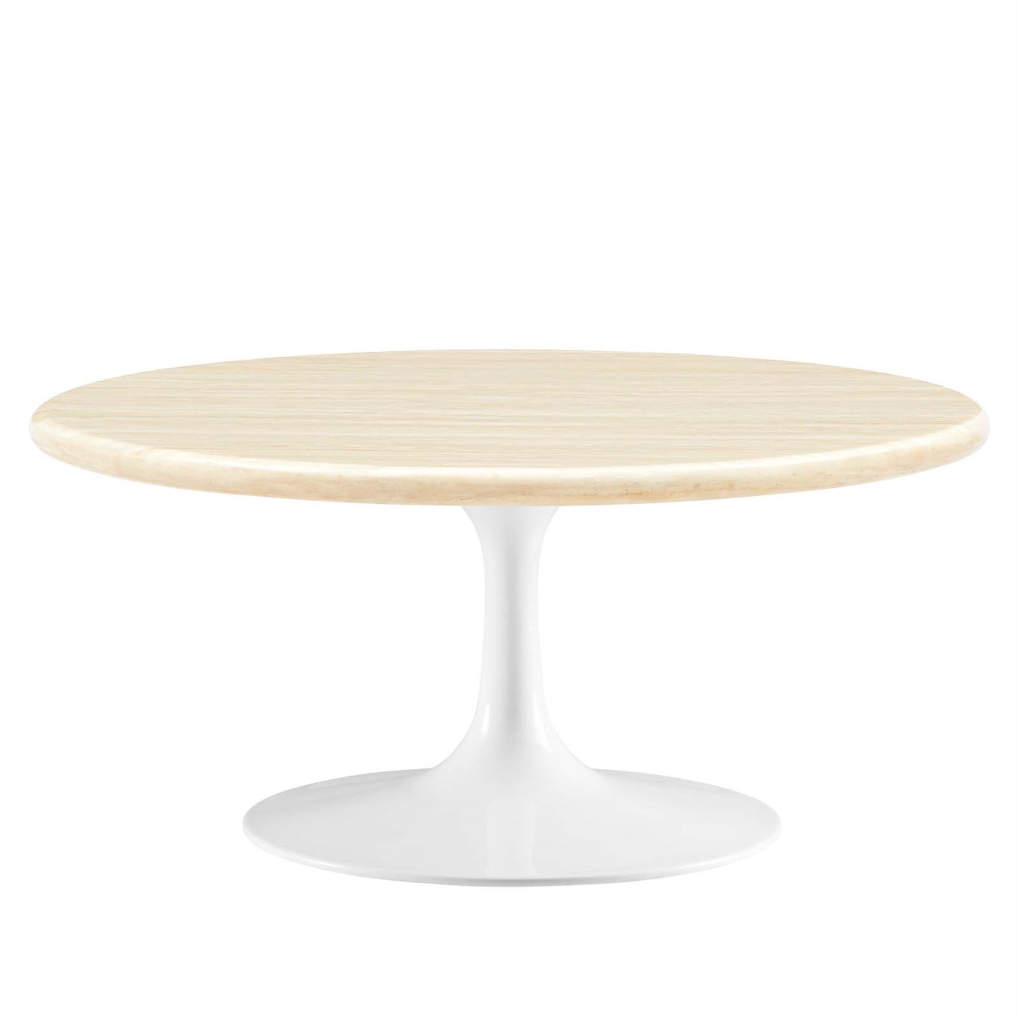 Embrace Day-To-Day With The Lippa 36 Round Artificial Travertine Coffee Table. A Flawless Fit For Any Lounge Space, The Exquisite Tabletop, Crafted From Artificial Travertine , Exudes Modern Elegance And Offers A Stylish Surface To Place Beverages And Snacks During Cozy Evenings In. Resting On A Tapered, White Metal Pedestal Base With A Chip-Resistant Finish, The Sleek Silhouette Complements Living Rooms, Lounges, Or Home Offices. Includes A Non-Marking Felt Pad To Protect Flooring. Assembly Required.Set Includes:One - Dia 36 Table Topone - Dia51X45Cmh Table Base
