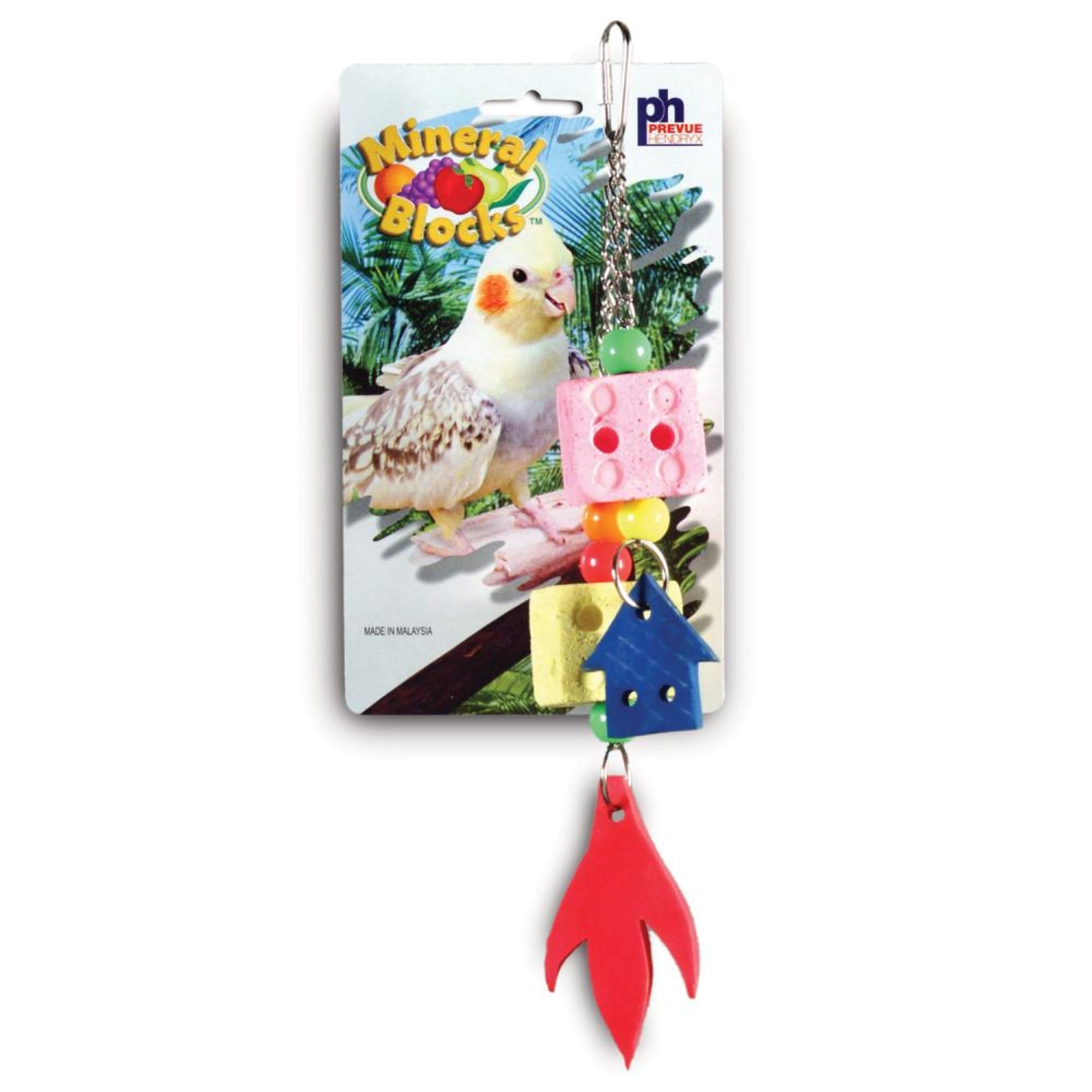 Prevue Pet Products Mineral Blocks With Toys 62390 Contain Natural Ground Seashell And Limestone Grit For An Excellent Source Of Calcium. Treats Are Fruit-Scented And Also Contain Iodized Salt, A Required Nutrient For Avian Health. Toy Measures 3' Wide And 10' Long.