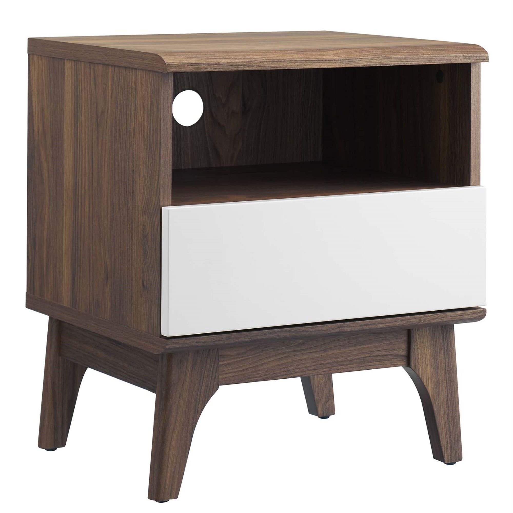 Elevate Your Bedroom Decor With The Envision Bedside Table. Featuring An Elegant Linear Silhouette, The Envision Nightstand Is Crafted With Walnut Grain Laminate Over Durable Particleboard For Reliable Support. A Spacious Full-Extension Drawer And An Open Shelving Area With A Cable Management Hole Offer Ample Storage Space For Bedside Essentials. Supported By Flared And Tapered Legs, Update A Primary Bedroom Or Guest Room While Keeping Your Visual Space Clean With This Versatile End Table., Set Includes : One - Envision Nightstand
