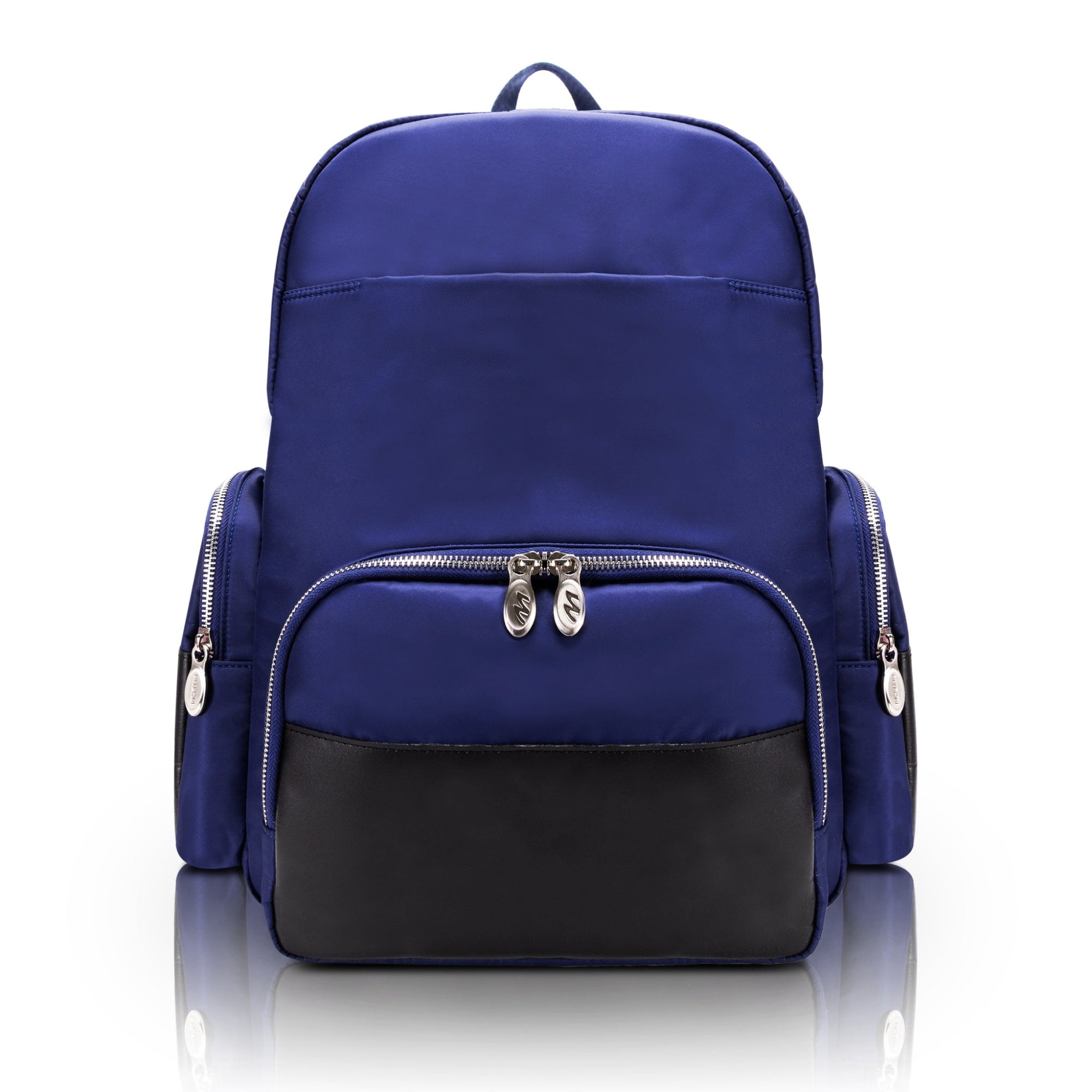 Nylon Dual Compartment Backpack. Fully-Lined Interior With Leather Accents And Triple Pocket Exterior. Easy Access Front Slip Pocket With Magnetic Closure. Front Spacious Compartment Features A Tablet Pocket With Organizer For Business Cards, Pens, And Accessories. Back Compartment Features Padded Laptop Protection With Padded Adjustable Backpack Straps With Leather Trim. Silver Accent Hardware And Metal Zippers. Nylon Smart Strap For Piggy-Backing Onto Rolling Cases.