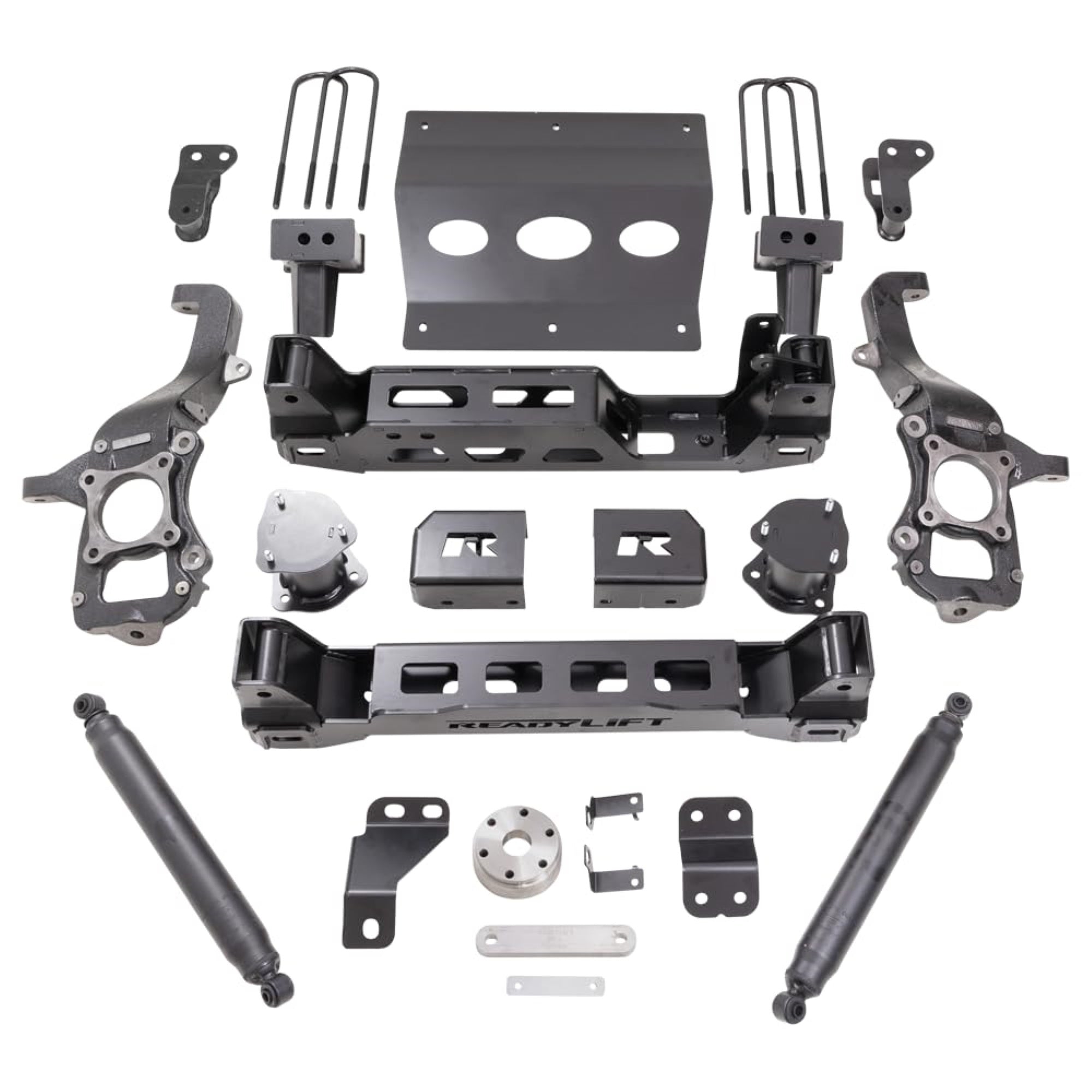 Readylift Is Now Shipping Our All-New 2021-2023 Ford F-150 4Wd 6' Lift Kit Delivering First-Class Ride And Handling With Plenty Of Tire Clearance Combined With A Great-Looking Lifted Stance In Our All-New Family Of High-Performance Big Lift Kits For Ford F-150 4Wd Models. This New Readylift 6' Lift Kit Is Developed To Give F-150 Owners A Complete Big Lift Option That Lifts The Front Of The Vehicle 6' Giving The Rear A Neutral Stance. The All-New Ford F-150 4Wd 6' Big Lift Kit Is Available In Our Base Kit That Delivers 6-Inches Of Lift Coupled With Our Twin-Tube Readylift Sst3000 Performance Rear Shock Sku 44-21600. The New Readylift Ford F-150 6' Kits Are Equipped With Heavy-Duty 1/4' Steel Plate Construction Front And Rear Crossmembers That Offer Unmatched Strength For All Driving Conditions. Featuring A Set Of Durable Lifted Knuckles And Strut Spacers, You Gain Enough Ride Height To Run Up To 35-Inch Tires With The Right Wheel! The New 6' Systems Include Everything Necessary To Correct Suspension, Steering, And Driveline Geometry To Maintain On-Road Handling While Improving Strength And Offroad Capability. Fabricated Steel 4' Tall Rear Block Offers The Correct Amount Of Rear Lift While The Factory-Style U-Bolts Aid In Ease Of Installation. Note: Does Not Fit Vehicles Equipped With Ccd, 2Wd Only, Tremor, And Raptor. Note: Not Compatible With Ford Bluecruise