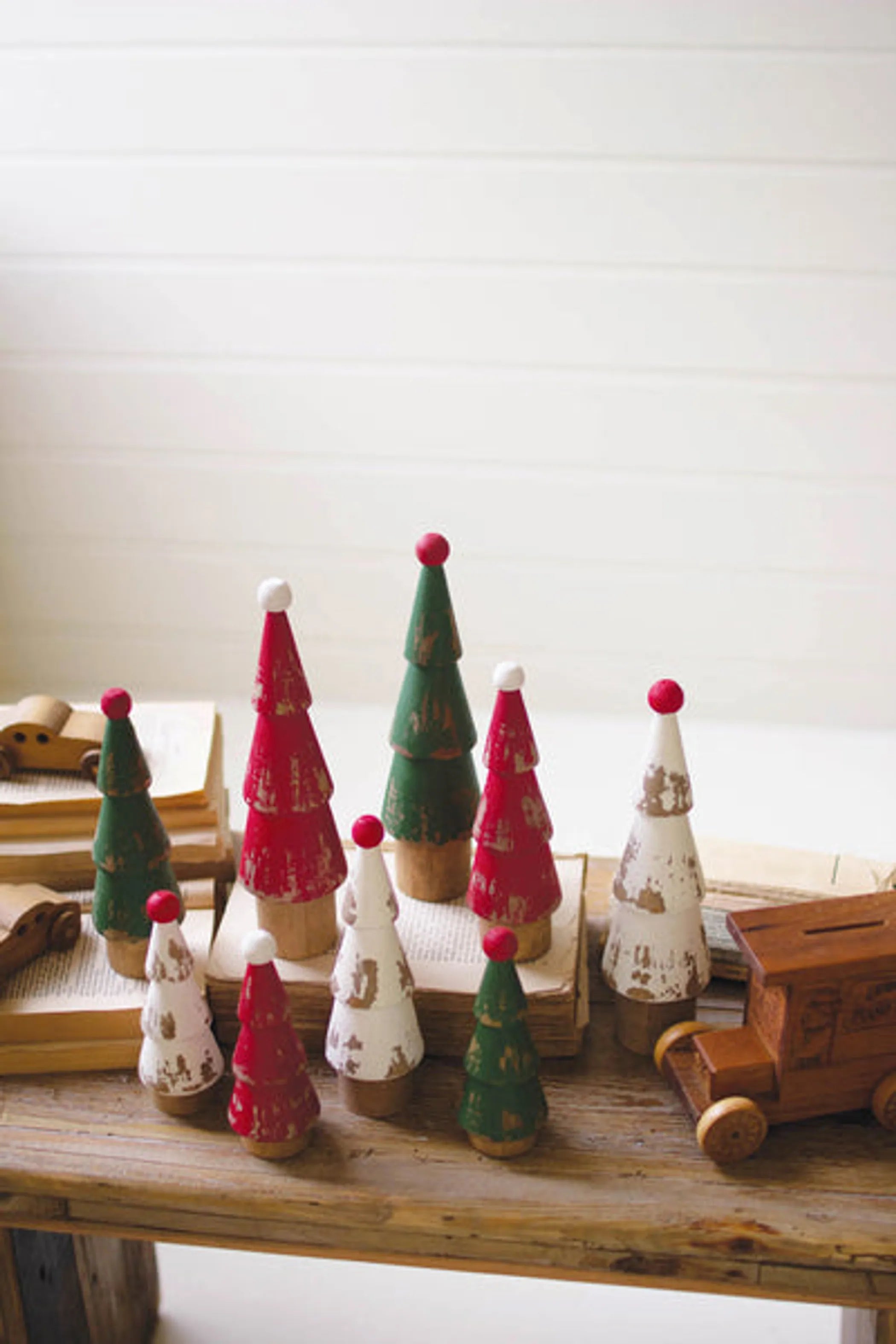 Create Your Christmas Village With This Set Of 9 Painted Christmas Trees. These Trees Come In Varying Heights And Are Painted Red, Green, Or White With Contrasting Ball Tops. Each Has Gilded Accents And A Gold Base.