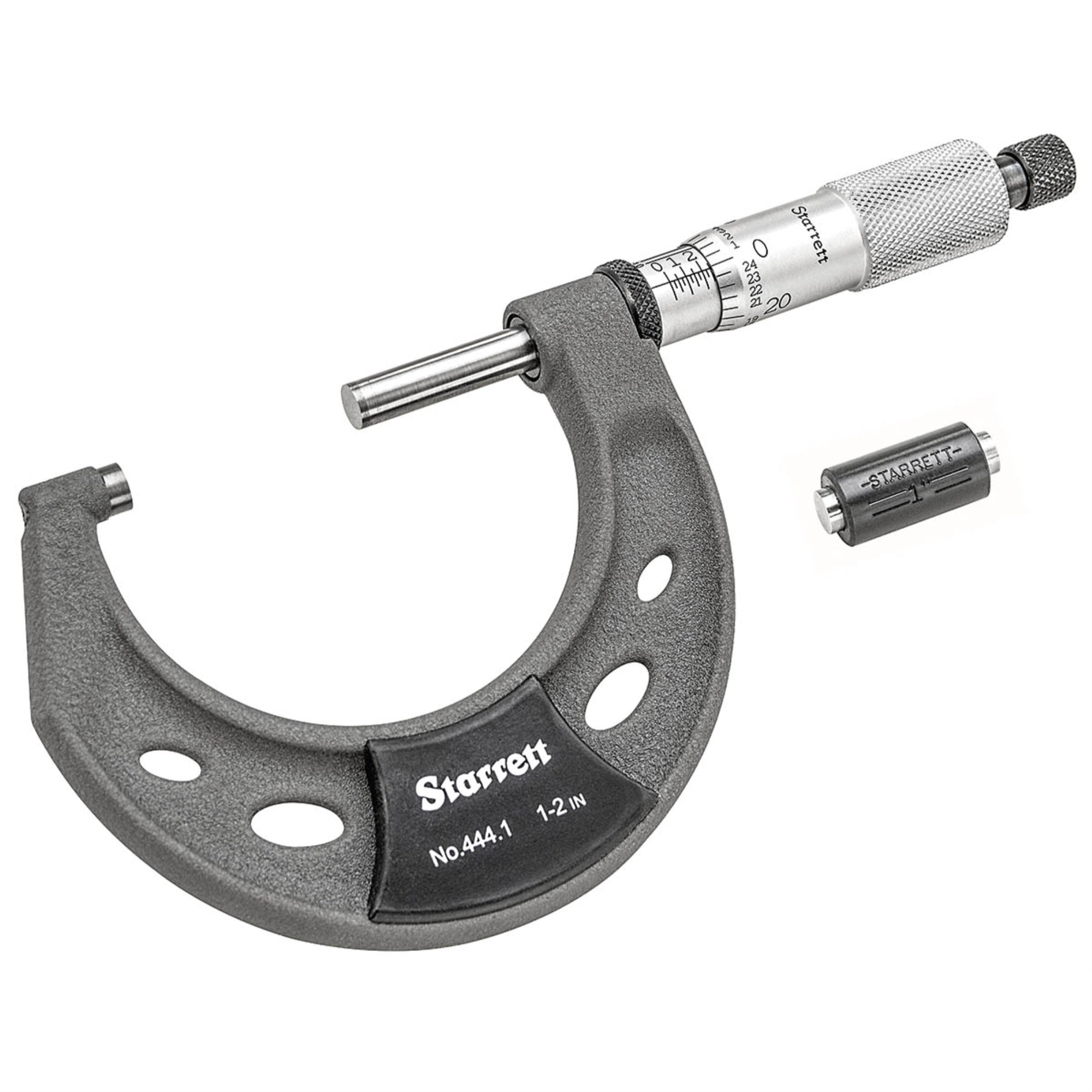 The Starrett 444.1 Outside Micrometer Features Ratchet Stop, Lock Nut, And Carbide Face. .0001 Grad, Ratchet Stop, Lock Nut, Carbide Faces.