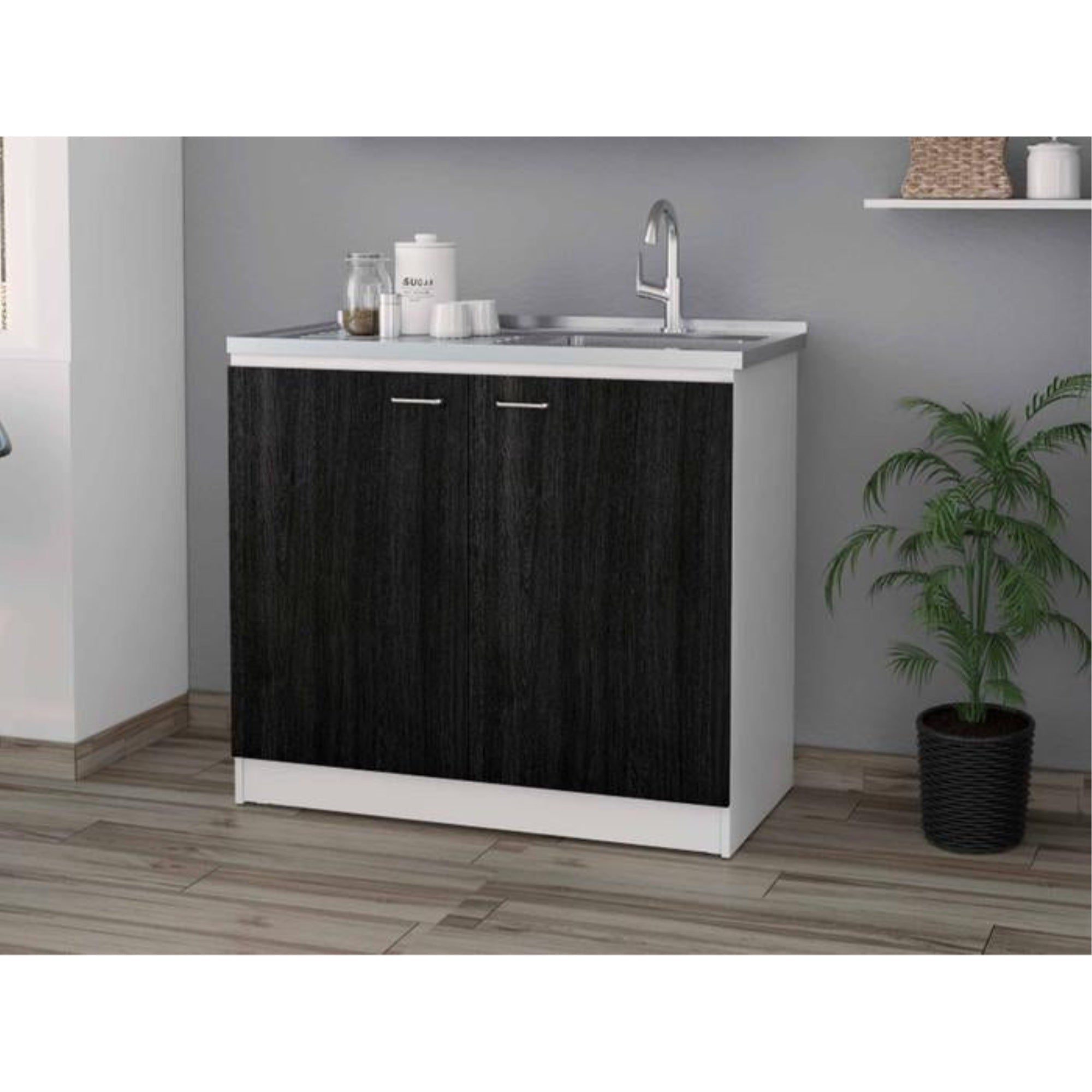Tuhome Napoles Utility Sink With Cabinet, Aluminium Countertop, Two-Door Cabinet, Metal Handle, Sink, Two Shelves, Black, For Ki
