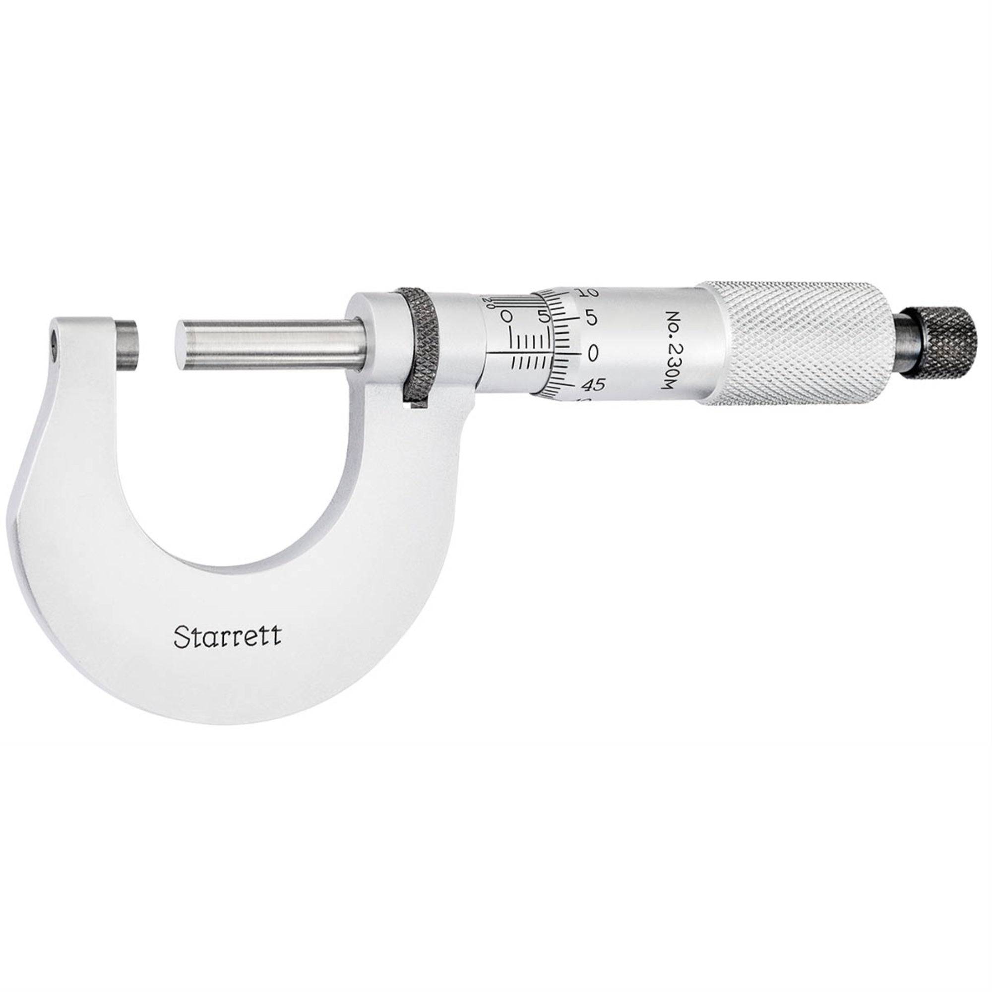 The Starrett 230 & V230M Outside Micrometer Features 0-1 Range, Ratchet Stop, Lock Nut, And Carbide Face. 0-25Mm Range, 0.001Mm Grad, Carbide Faces, Ratchet Stop, Lock Nut.