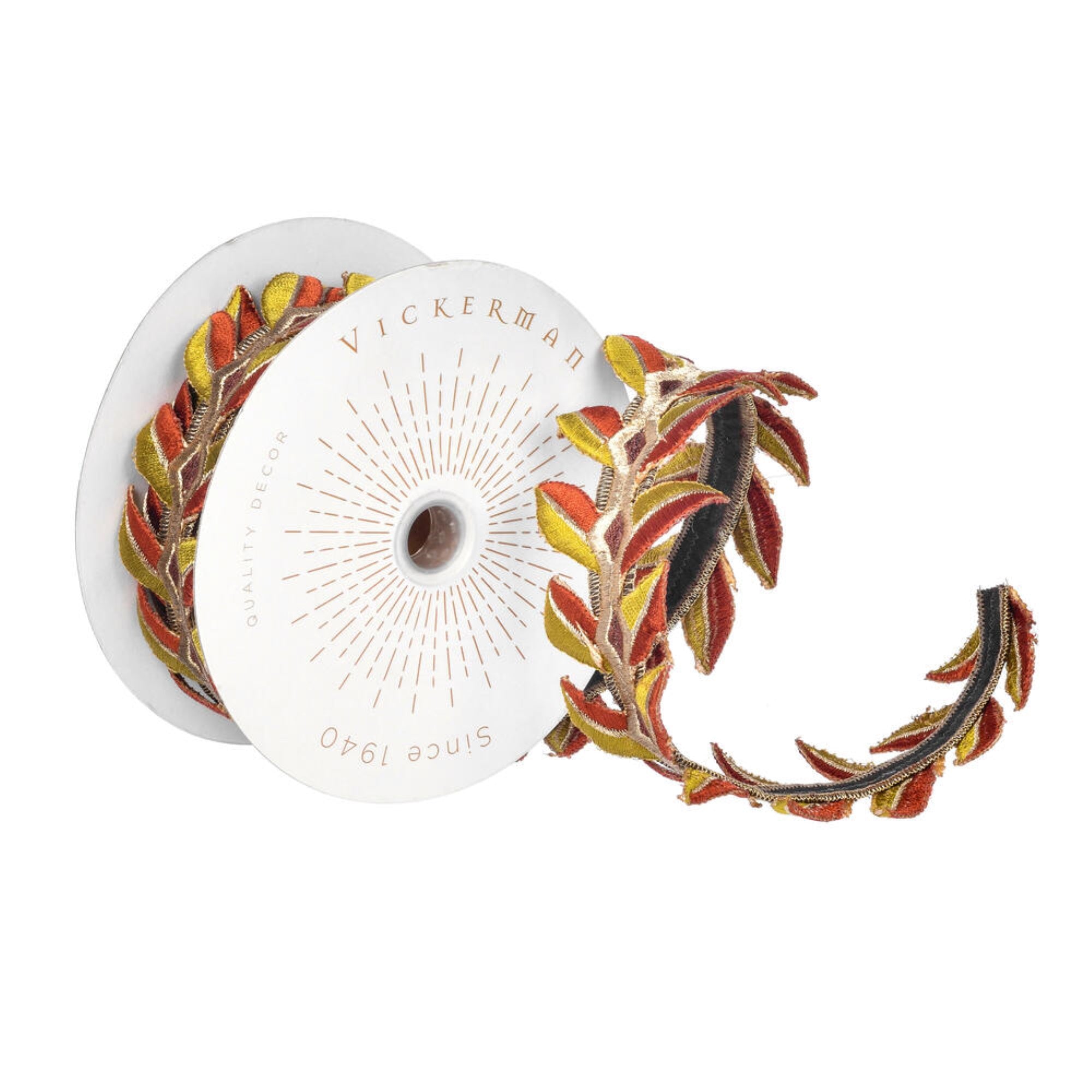 Vickerman 2.5 X 5 Yards Olive Harvest Leaves Wired Edge Christmas Ribbon.